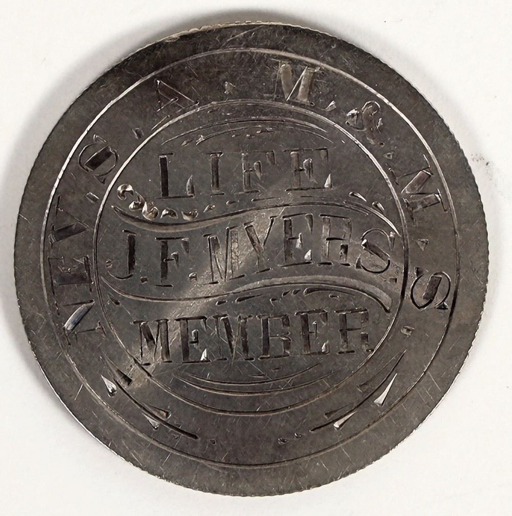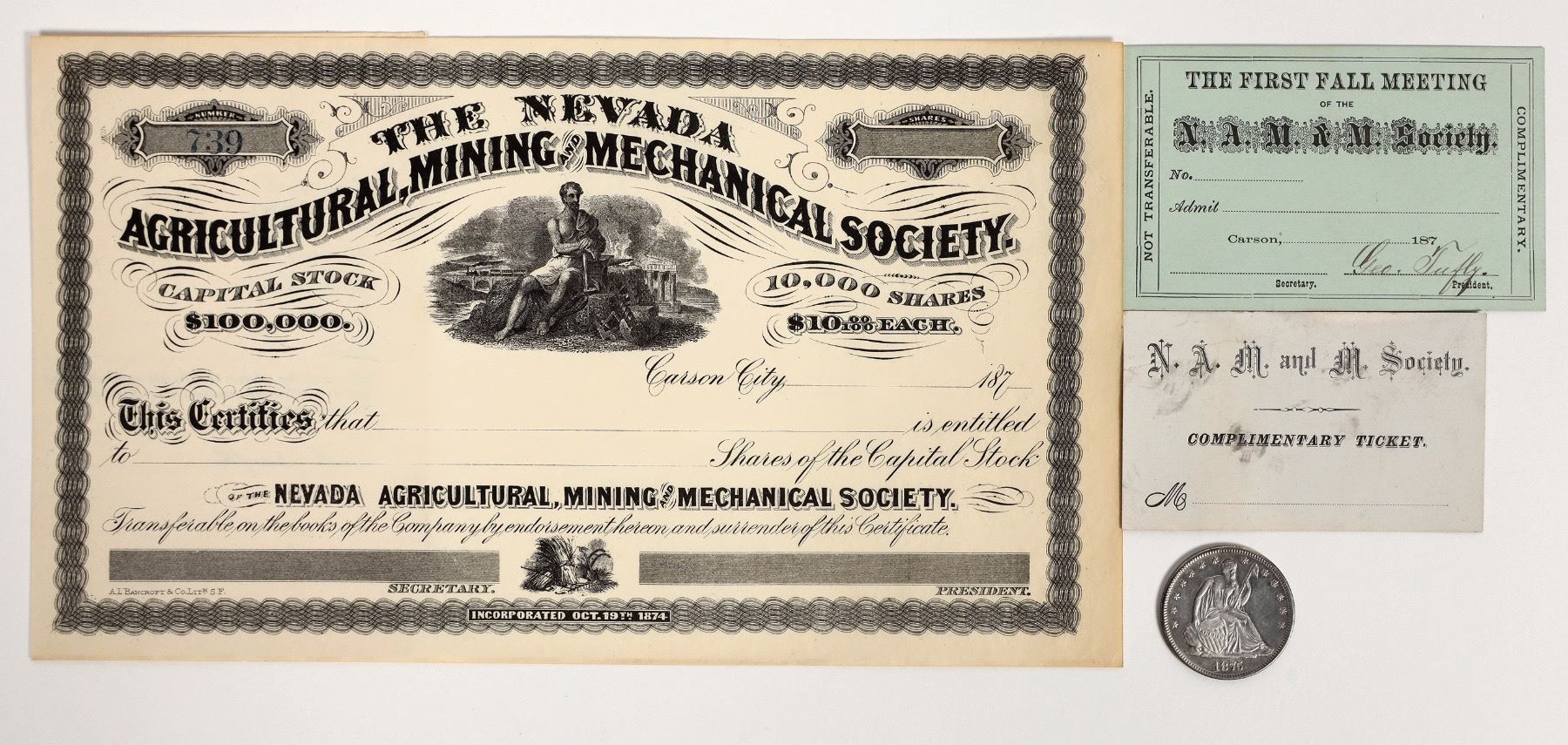 Nevada Agricultural, Mining and Mechanical Society, Carson City, c.1875. Here are four items from the society: 1) Stock certificate from the society, unissued, like new. 2) Engraved US half dollar, "Nev. S. A, M. & M. S. / Life / J. F. Myers / Member // (obverse of an 1875 half dollar), perhaps from the Carson City Mint, XF. As illustrated in Fred Holabird's "Ghost Towns and Medicines: The Nevada Bottle Book Volume Two" pages 221-224. 3) "N. A. M. & M. Society, Complimentary Ticket." Unused, white card, 50mm by 82mm, small smudge. 4) "The First Fall Meeting of the N. A. M. & M. Society, Complimentary (ticket)," hand-signed by President Geo. Tufly. J. F. Myers was a well-known druggist in Reno from as early as 1879 through at least 1890. George Tufly operated the St. Charles Hotel in Carson City from 1866 to 1875 and was the Nevada State Treasurer 1883-1890 but died the following year. Unused, blue card, 60mm by 97mm, like new.