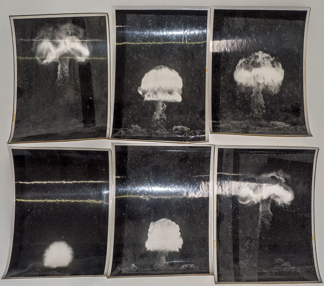 Lot of six different 8" x 10" black-and-white photographs showing an atom bomb test explosion. The family believes these were taken by N.E. Wilson, who was a noted chemist with the University of Nevada, Reno. Condition: photographs have glue residue on reverse, are bowed and soiled. From the Gordon Harris Estate.