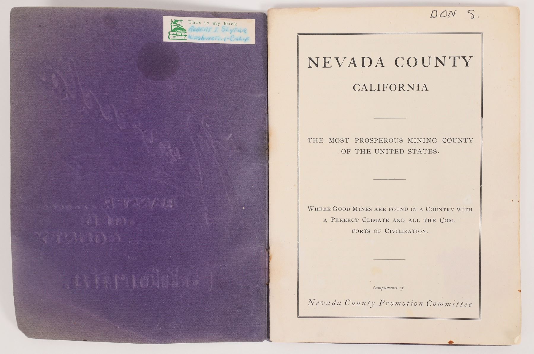Nevada, The Banner Gold County of California booklet, undated. Lots of mine and area photos. 6.75x5". Cover and next page detached, staple rust. California Nevada County