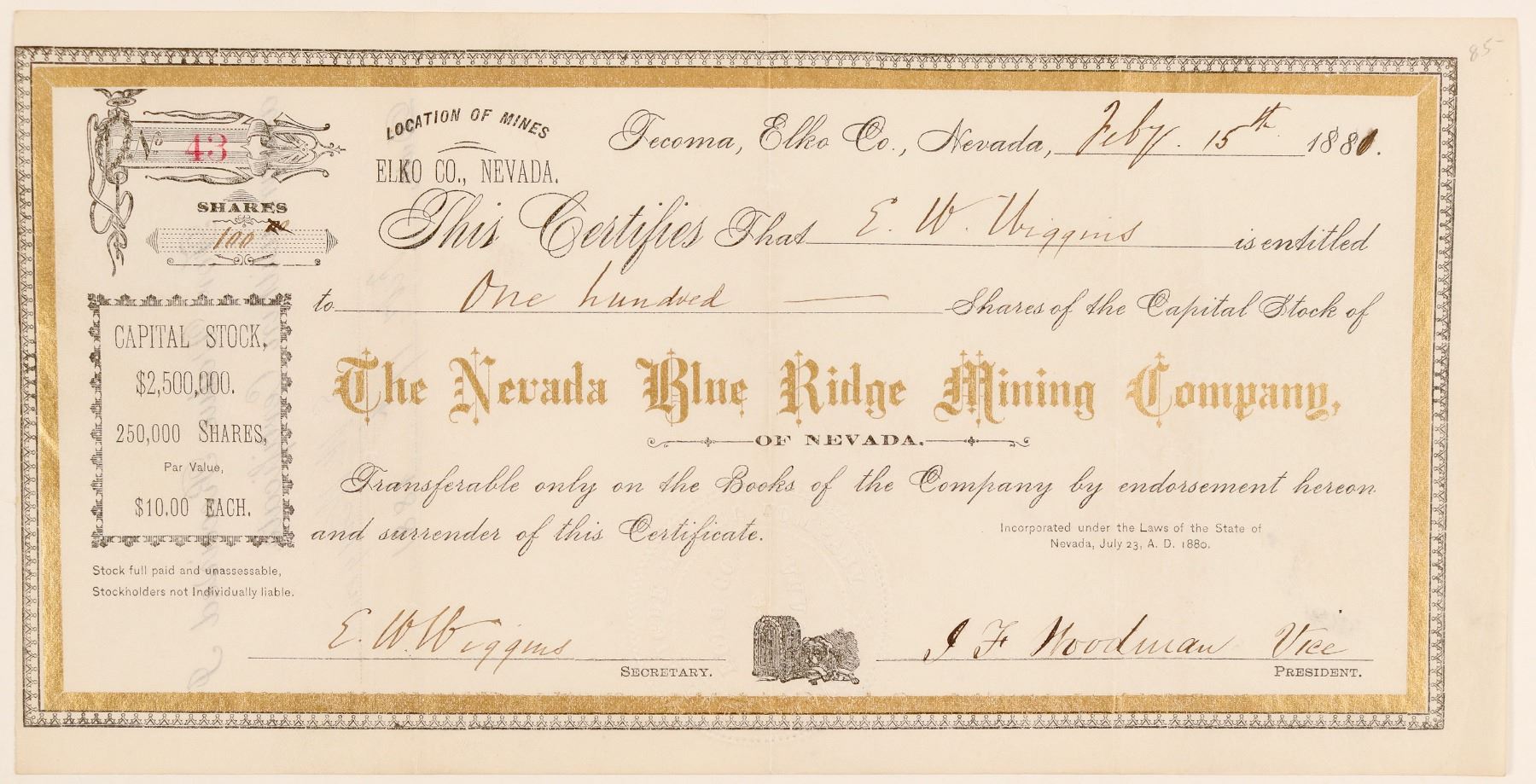 Dateline Tecoma, Elko Co., Nevada, Feb 15th, 1881. "Location of Mines: Elko Co., Nevada" (printed at upper left). No. 43, issued for 100 shares to E.W. Higgins, company secretary. Also signed by vice-president J.F. Woodman. Not cancelled. Black and gilt border. Gilt title. Folds. No printer listed. 5 x 9.75" Tecoma was known as a railroad stop for mines in other districts. Few local mining companies were ever formed. There was also a famous Blue Ridge Mine in Lander County. () Ken Prag Collection