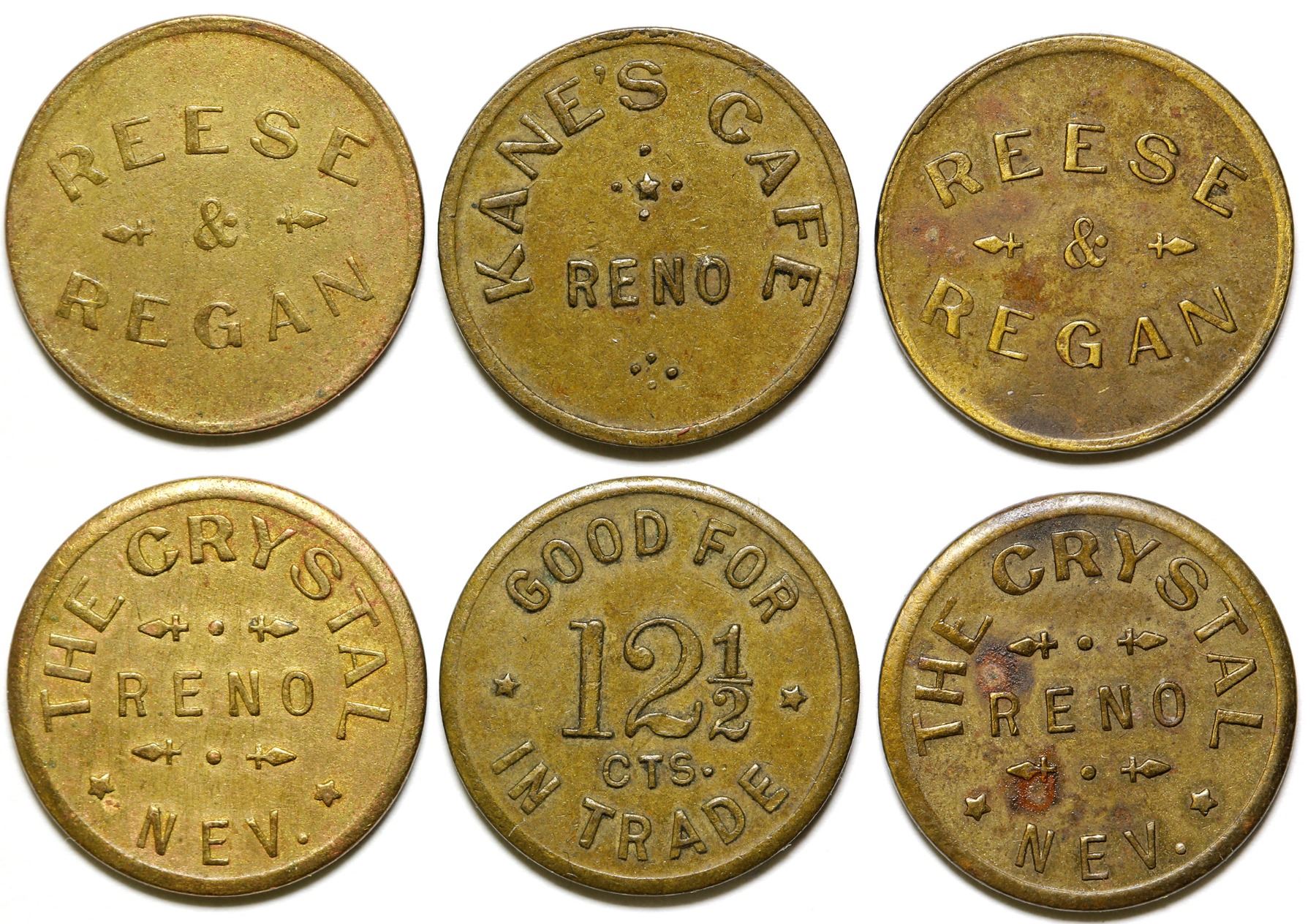 Lot of three: 1 & 2) Reese & Regan; The Crystal / Reno / Nev.; Br., rd., 21 mm. 3) Kane's Cafe / Reno; Good for / 12 1/2 / cts / In Trade; Br., rd., 21 mm.