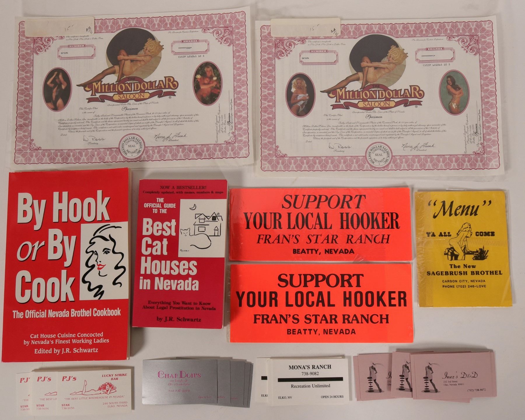 Items from some of Nevada's famous Brothels. Two bumper stickers from Fran's Star RanchBeatty; Menu from Sagebrush Brothel in CArson (the best piece in the collection), book: Best CAt Houses in Nevada by Schwartz1995 signed; book: by hook or by cook by Schwartz, also signed, 1996; pile of about 60 business cards for Elko brothels whicjh include the famous Lucky Strike (Been there about 100 yeras) and others. Two different stock certificates fro the Million Dollar Saloon (specimens)- (incorp in Nevada, but the saloon was in Texas!)