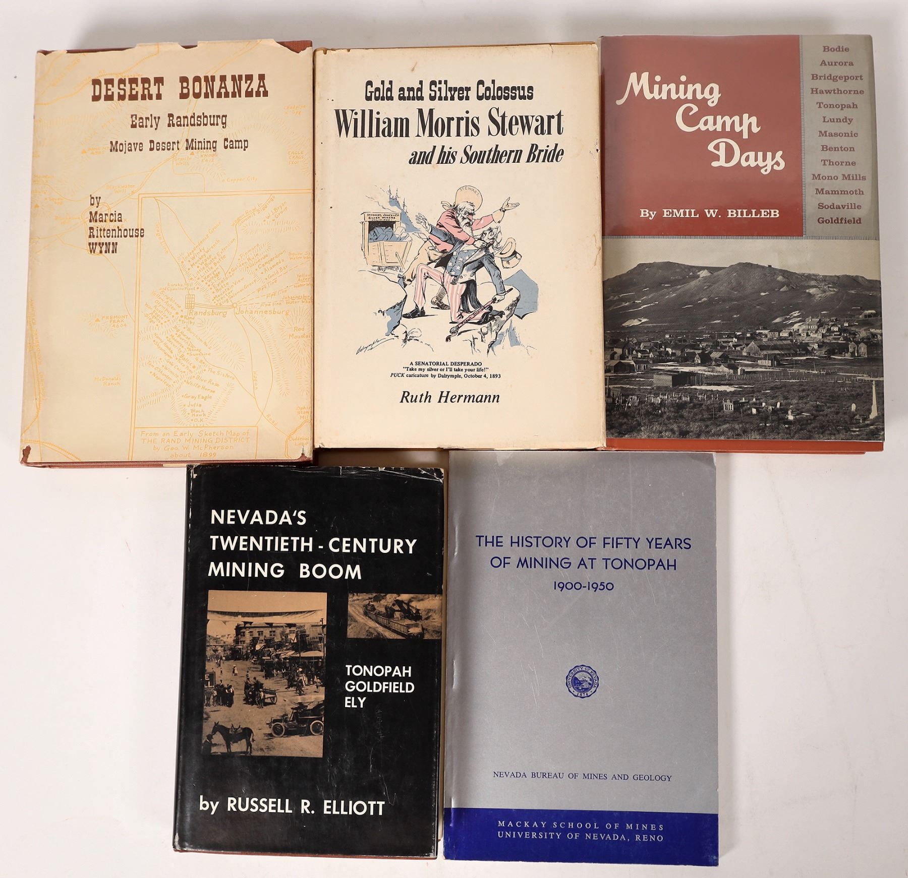 "Desert Bonanza", The Story of Early Ransburg, Mojave Desert Mining Camp, by Marcia R. Wynn, publ. by Arthur H. Clark Co., Glendale, CA, 1963 ~ with 33 illustrations and maps (6" x 9" HC, 275 pages) "Nevada's 20th Century Mining Boom", by Russe1l R. Elliott, Publ. by University of Nevada Press, Reno, 1966 ~ Features Tonopah, Goldfield & Ely~ Includes 18 illustrations, 2 maps and 2 tables~ (5" x 8" HB, 344 pages) "The History of Fifty Years of Mining at Tonopah, 1900-1950 University of Nevada Bulletin No.l, Jan., 1953, by Carpenter, Elliott & Sawyer., publ. by Nevada Bureau of Mines, Reno~ 12 Illustrations,153 pages, 6" x 9", SC