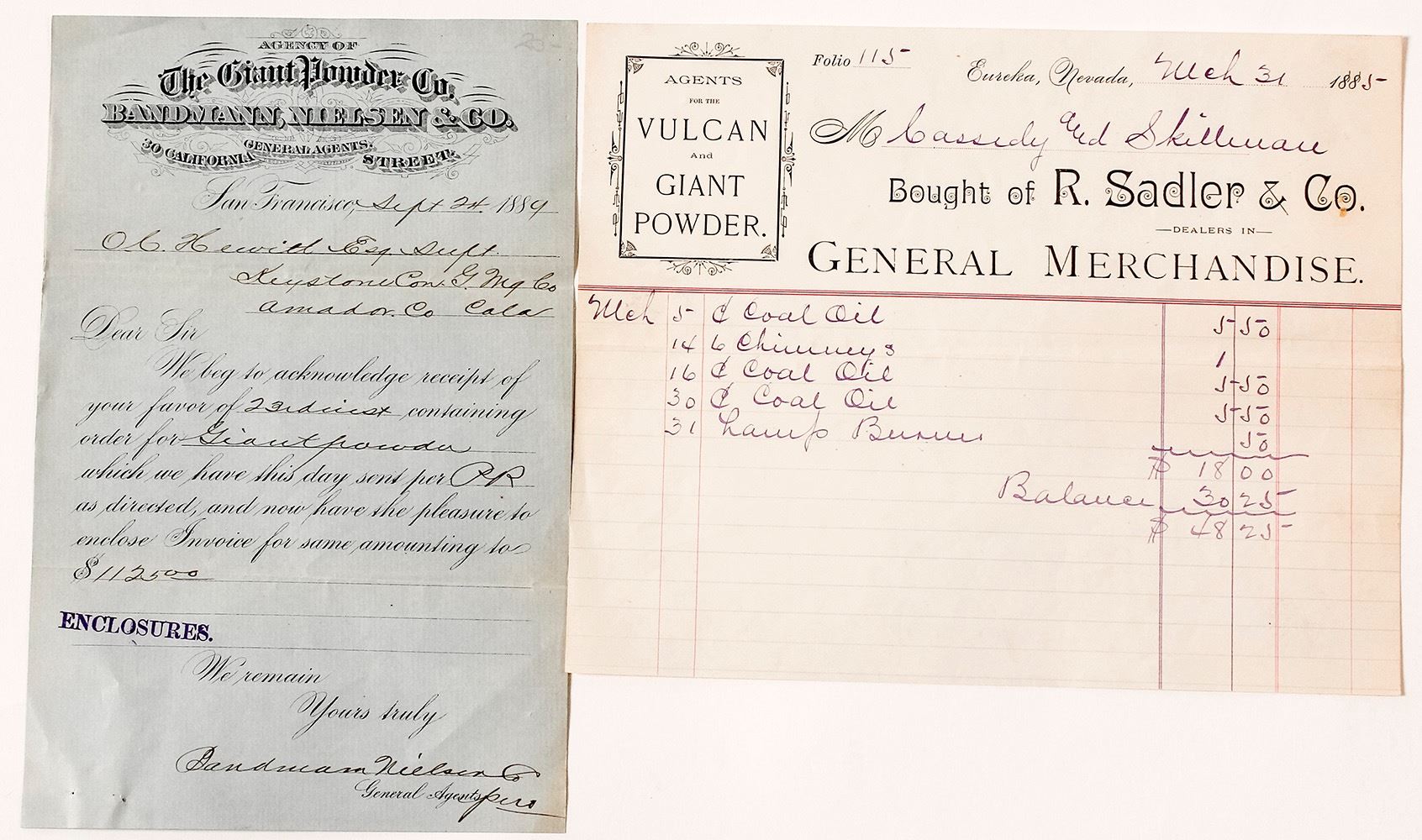 Lot of two. 1) Rare billhead for R. Sadler & Co., Agents for the Vulcan & Giant Powder, Eureka, Nevada, 1885. Billed for coal oil to Cassidy & Skyline. 2) Giant Powder Co., Sandman, Milson & Co. letterhead, San Francisco, 1889, to the Keystone Cons. Mining Company. Date: 1885-1889 Location: Nevada HWAC# 572023