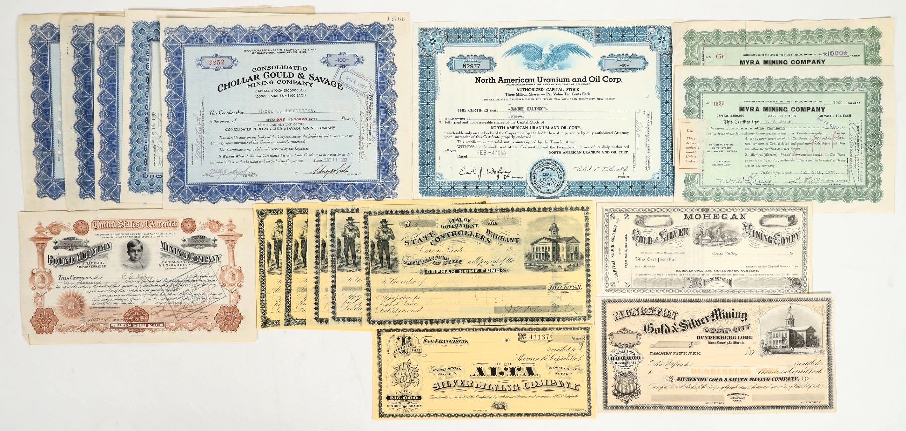 Group of 17 stocks from various mining operations based in Nevada and California, dated 187X to 1957. Lot includes 2x Myra Mining Company; 5x State Controller's Warrant from Carson, NV; 5x Chollar Gould & Savage Mining Company; and 1x each from Munckton Gold & Silver Mining Co., Mohegan Gold & Silver Mining Co., Round Mountain Mining Co., Alta Silver Mining Co., and North American Uranium and Oil Corporation. Lot includes some nice vignettes, including a classic miner vignette on the State Controller pieces. 14 issued, 9 cancelled; see photos for more detail.