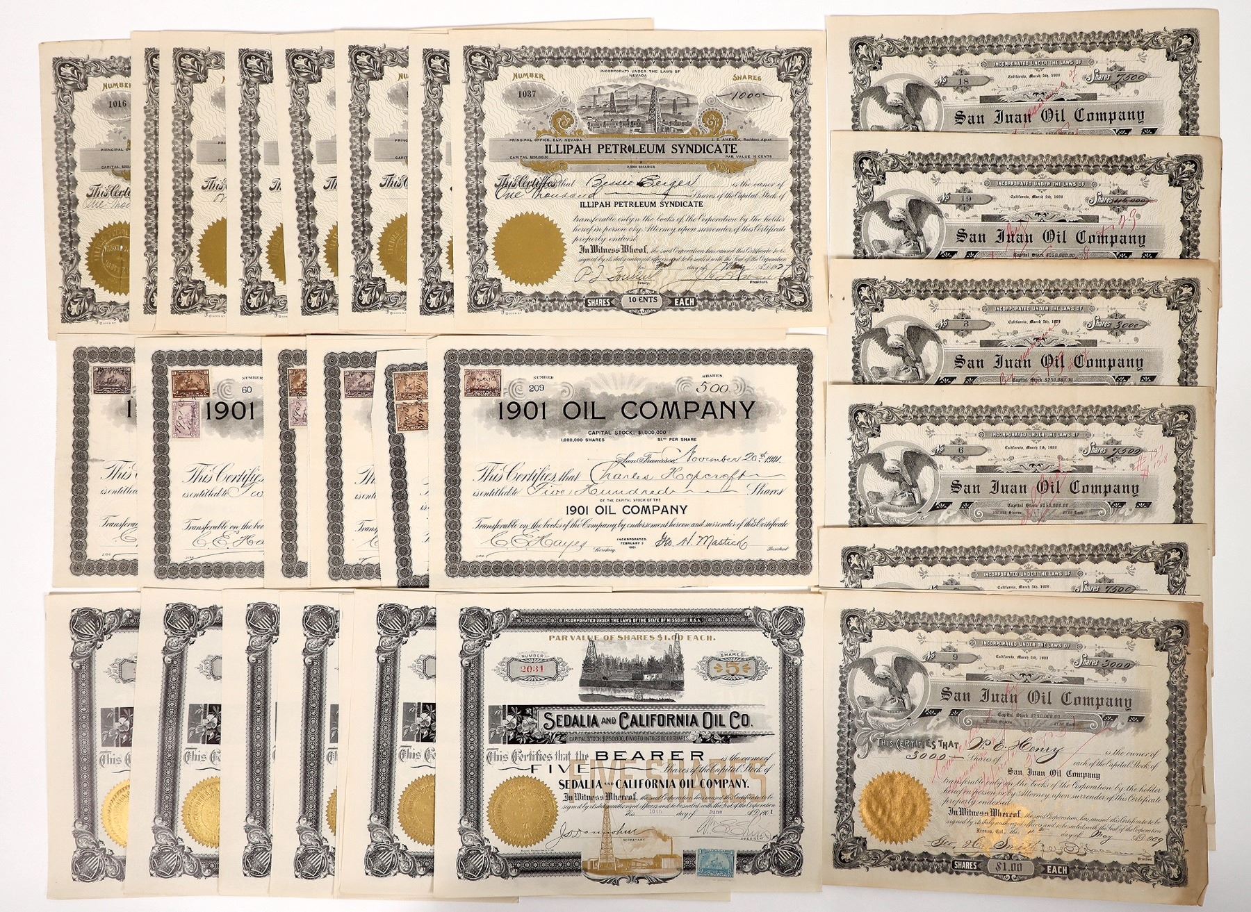 Group of 34 stock certificates from four Nevada or California-based oil companies: the Illipah Petroleum Syndicate (11), San Juan Oil Company (8), 1901 Oil Company (7), and Sedalia & California Oil Company (8). Certificates date 1901-1926. All certs are issued, all San Juan certs are cancelled. Great oil field vignettes on Illipah and Sedalia certs. Some creasing/minor tearing on some certificates.