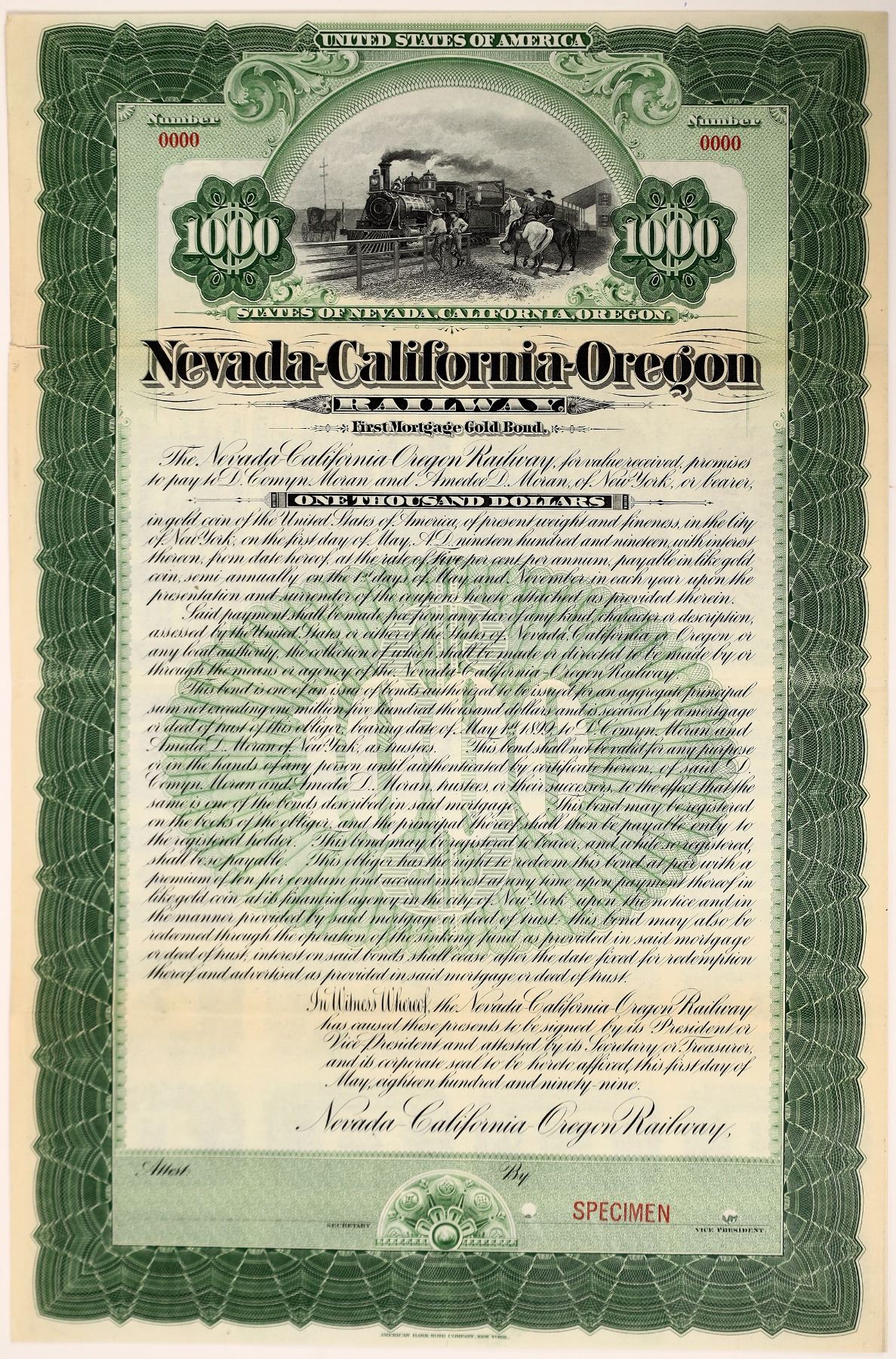 Rare. Specimen $1,000 bond. May 1899. Green border and background, black print, and locomotive with cowboys vignette. Printed by ABN. Stamped Specimen on signature line and hole punched. Sheet of 36 coupons attached. 14 x 9.25" Organized in Reno, Nevada in 1880 as the Nevada and Oregon Railroad. The plan was to build north from Reno through Northern California and Oregon to eventually reach The Dalles. Known as the "Narrow, Crooked & Ornery" Railroad due to poor management, a stockholder meeting famously ended in a gunfight between two members. The farthest north they reached was Lakeview, Oregon by 1912.