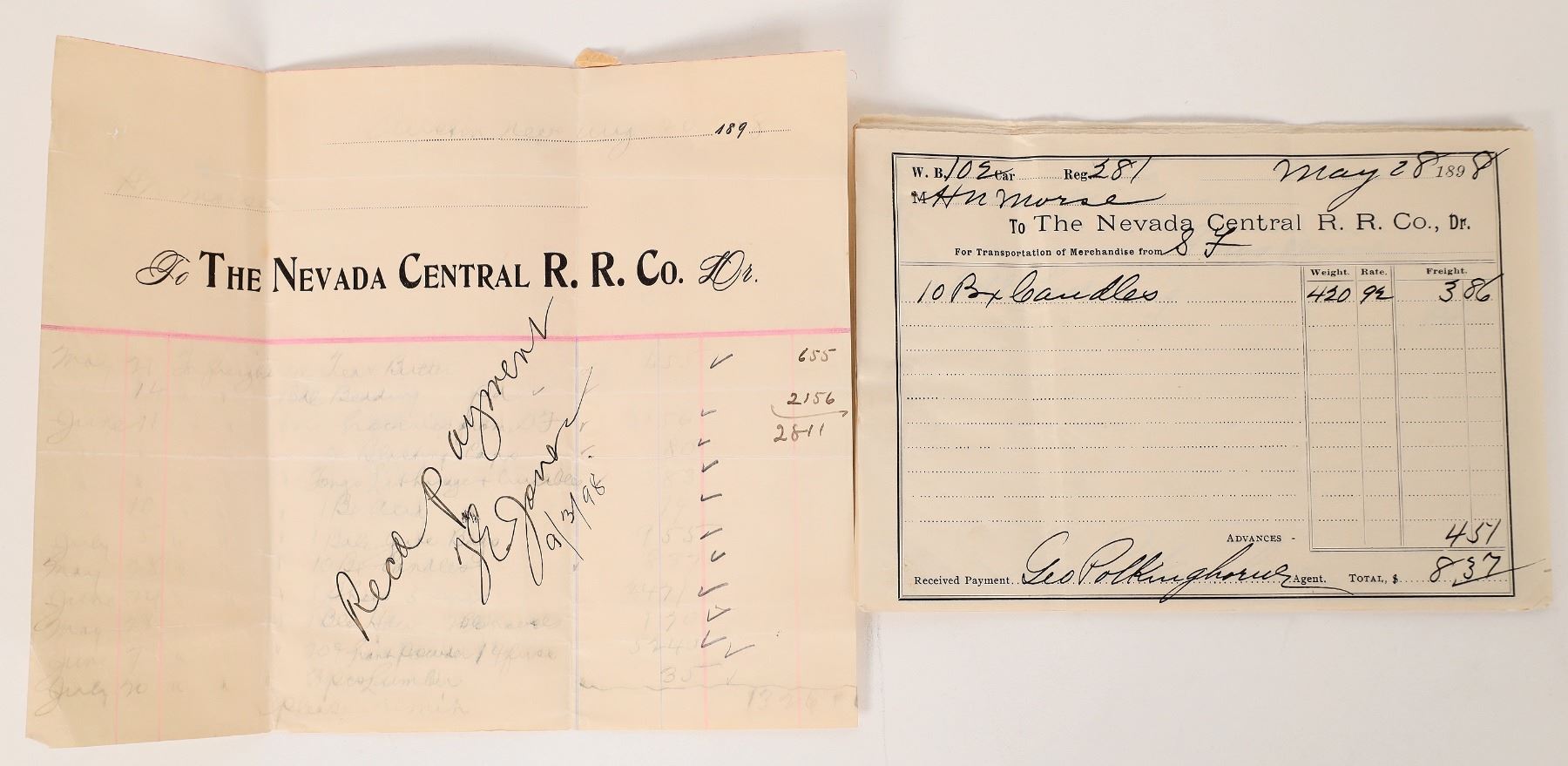 11 Nevada Central Railroad receipts, c. 1898, shipped from San Francisco to Austin, NV including mining candles, blasting caps, crucibles, acid, shovels, Giant Powder, fuses etc. Nevada c1898