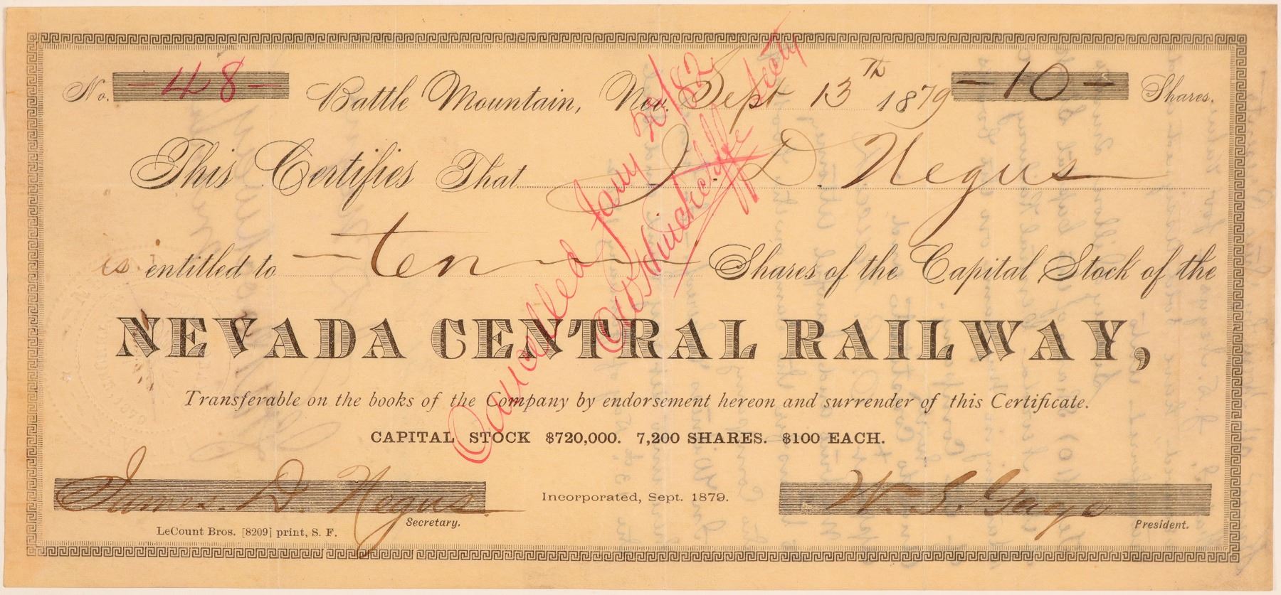 #48, I/C, 10 shares of common stock @ $100 par. issued to J.D. Wegus Sept 13, 1879. Signed W.S. Gage President, BLACK, embossed seal, no vignette. Reverse handwritten note of transfer. LeCount Bros printer. Not found in any reference researched. VF cond Ken Prag Collection