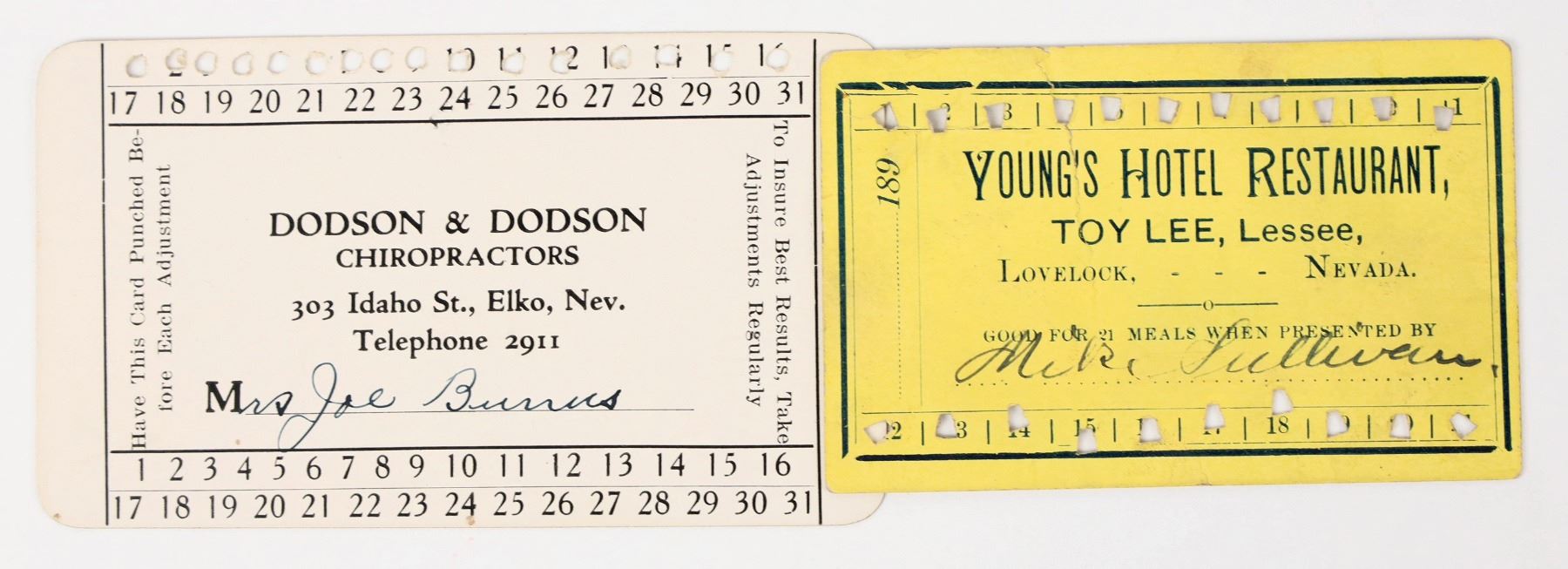 Lot of 2 different. 1) Exceptionally rare cardboard meal ticket for Chinese merchant Toy Lee of Young's Hotel Restaurant, issued in 1890s. Chinese characters on the reverse. Only a few of these are known. 2) Bonus piece is a punch card for Dodson & Dodson chiropractors, Elko, Nevada.