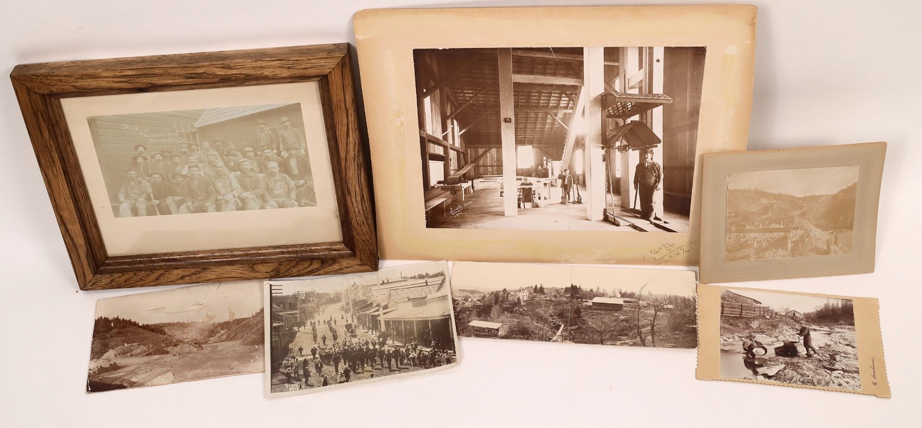 Home/Champion Mine-poor contrast. Temple and Clair, sluicing 1899 by Gerrebrands Building panorama. Firemans Parade on Main Street. Providence Mill. Framed day shift at Providence Mine-poor contrast, frame 9.5x11.25". Mineshaft head by Swart 7.75x9.5". Nice historical suite. Nevada City California