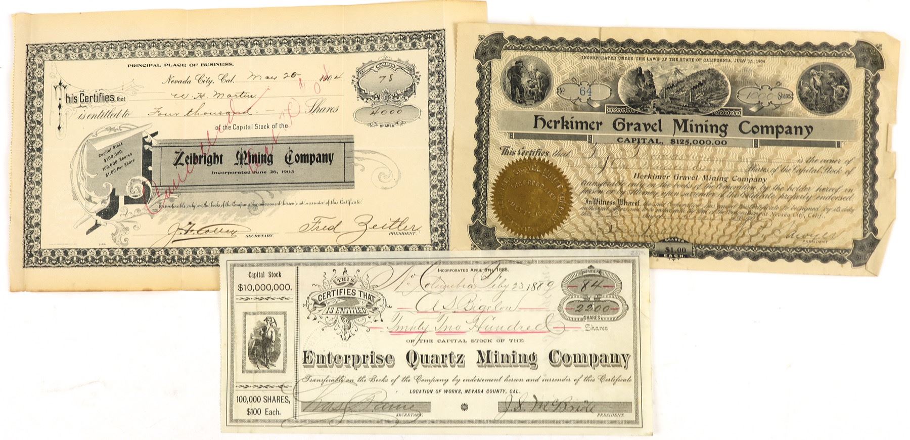 Lot of 3 different. 1) Enterprise Quartz Mining Company. No. 84, issued for 2,200 shares to AS Bigelow on Feb. 23rd, 1889 in North Columbia. Signed by president JS McBride and secretary Chas. Paine. Not cancelled. Black border and print, prospector vignette. Folds. 4 x 9.75" 2) Zeibright Mining Company. No. 78, issued for 4,000 shares to WH Martin on May 20, 1904. Signed by president Fred Zeitler and the secretary. Pen cancelled. Folds, toning. 3) Herkimer Gravel Mining Company. No. 64, issued for 1,000 shares in 1906. Not cancelled. Three mining vignettes. Folds with separation, rips on right border. City:Nevada City State:California Date:1889-1906
