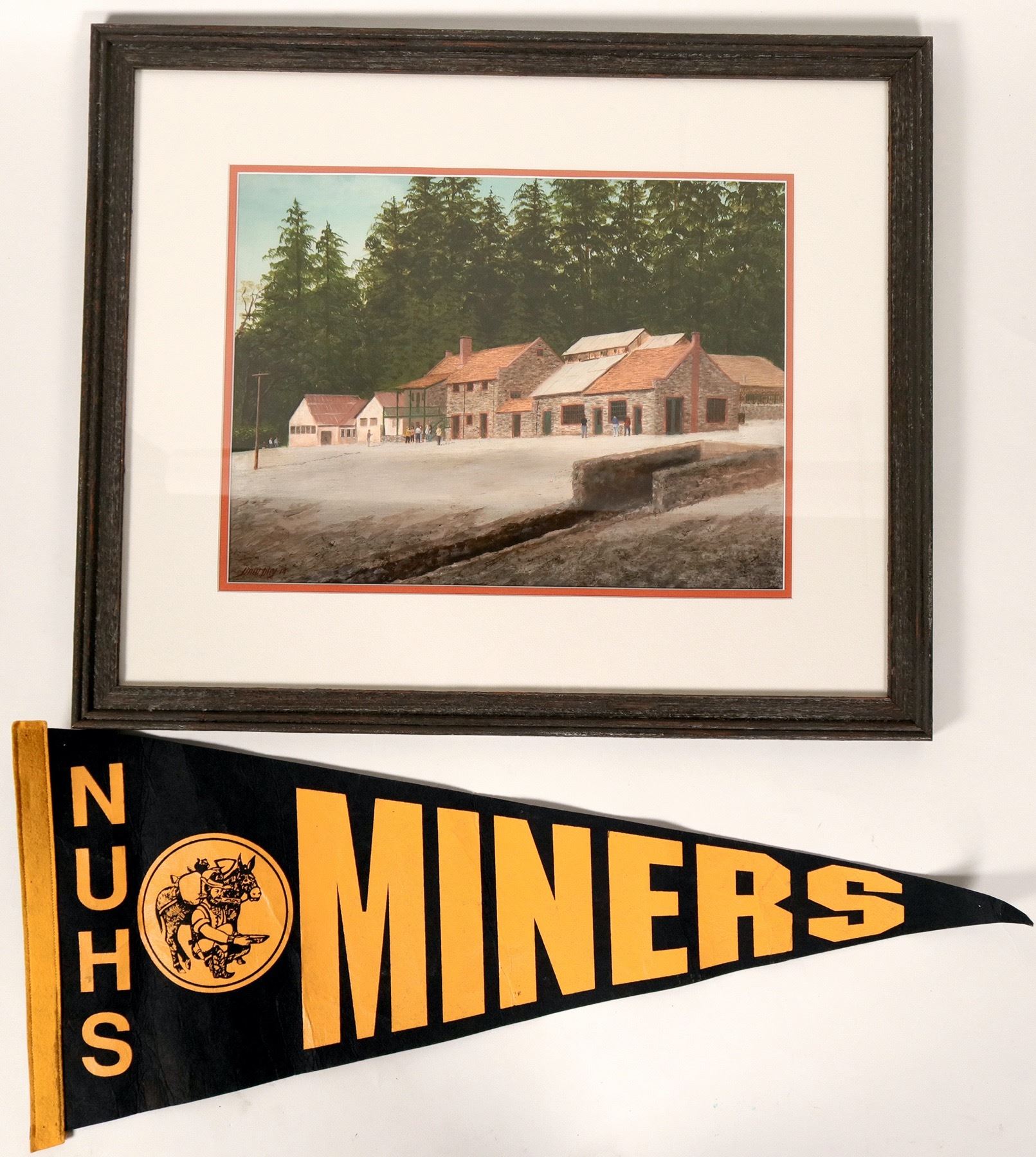 1. Beautifully framed picture of the Empire Mine measuring 20" x 24". Printed by Daved McKay, entitled "Heart of the Empire" from original oil painting by Jerry Murphy. The building pictured here is the location of the Empire Mine Museum today, part of Empire Mine Park Association. The rock structure in the foreground held the very large pipe that supplied water to the Pelton Wheels before electricity. The Pelton Wheels powered all the equipment in the Empire Mine. 2. Vintage Nevada Union High School Miners Banner Flag.