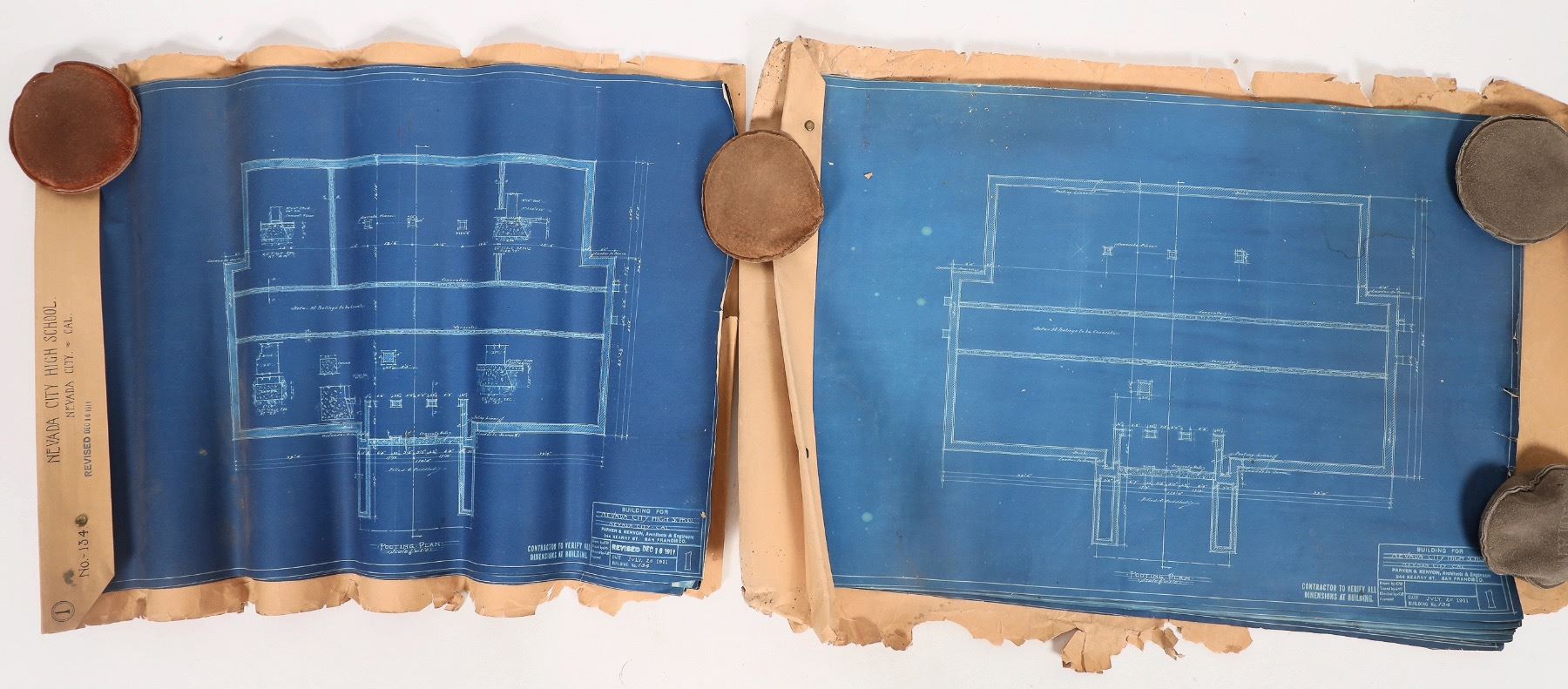 Sets of blueprints for Nevada City High School in Nevada City, California. This school opened in 1912 after a $30,000 bond was passed in 1911. Drawings measure about 16"x 22" and there is slight water staining on some. Please see photos for more details.