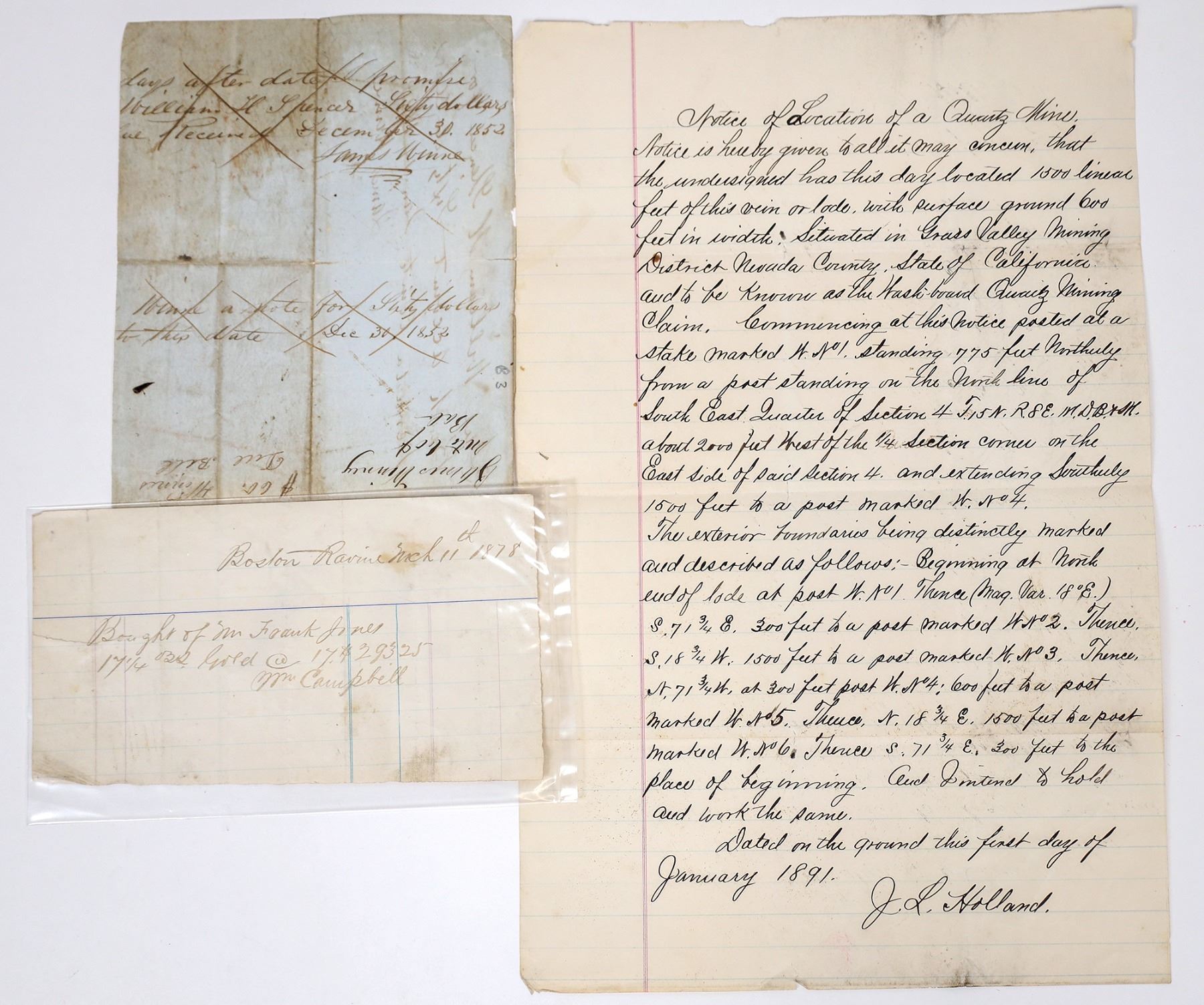 Lot of three. 1) Notice of location by J.. Holland in 1891. Location at Grass Valley Mining District. 1000' x 600'. 2) Purchase of (?) at Boston Ravine. Boston Ravine is a former settlement in Nevada County, California. Boston Ravine is located 1 mile south-southwest of Grass Valley. 3) 1852 note on mining company.