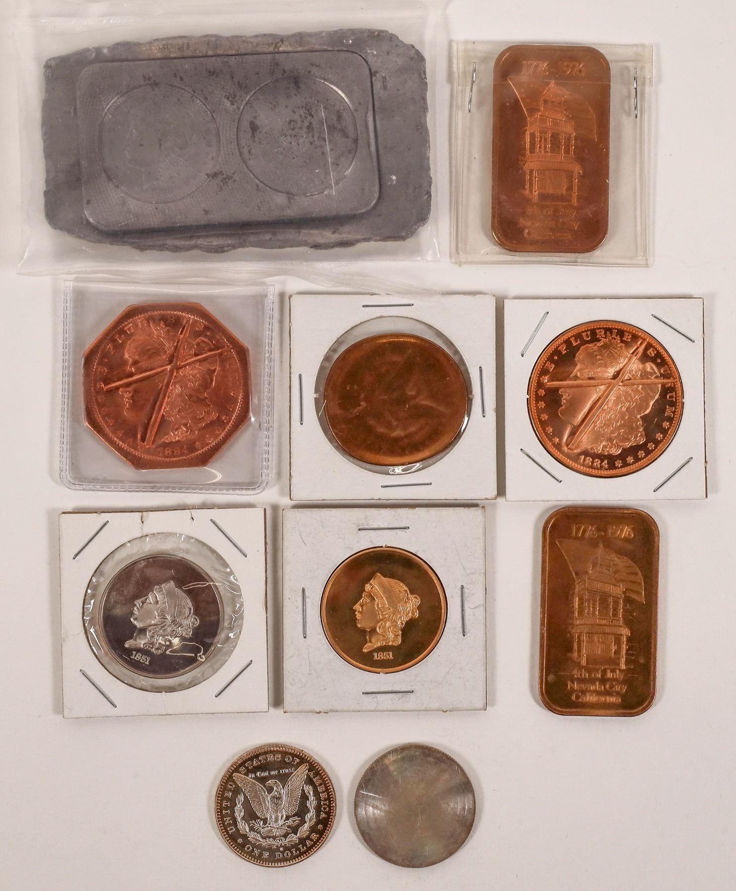 Lot of ten coin related pieces from the Nevada City Mint. 1884 Morgan dollar cancelled obverse in copper, octagonal shape; two 1976 Bicentennial bronze ingots 4th of July, Nevada City; white medal classic head, state of Nevada Seal on reverse; bronze classic head uniface dated 1851; 1884 Morgan dollar cancelled obverse in copper, uniface; two "S" mint Morgan dollar reverses on white metal, no obverse; 1883-S Morgan dollar planchet die, obverse and reverse side by side; weakly struck Morgan dollar reverse in bronze.