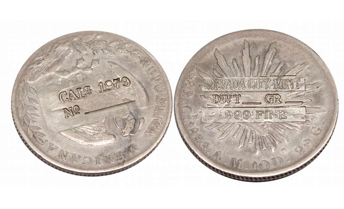 Circular ingot with a modern over stamp on a Mexican 8 Reales silver coin dated 1896. .86 troy oz..999 silver.City: Carson CityCounty: State: NVDate: c1896