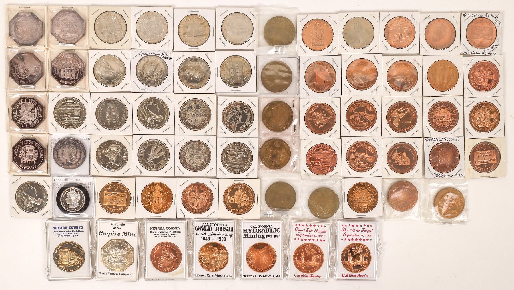 Lot of 39 copper/brass and 20 white metal pieces made by the Nevada City Mint. 1883-CC small facsimile Morgan dollar (.999 silver, 15.6 grams silver); seven octagonal gold rush commemoratives: Coloma, Mariposa, Sierra City, Columbia etc. Nevada City California