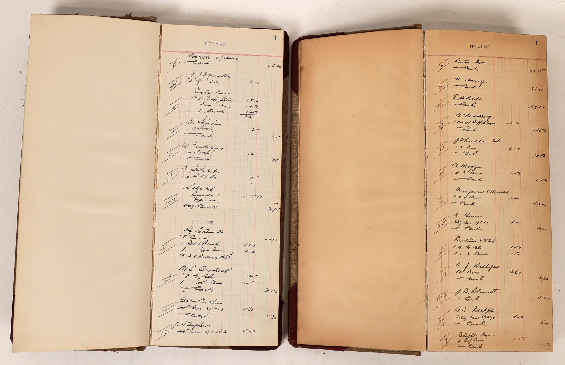 2 Nevada City day books from a brewing and soda distributor of Raineer Beer, Buffalo and H Lager by cases etc. as well as soda and root beer during Prohibition. These books are possibly from Nevada City Soda Works. From the Powell Nevada City Soda Works Collection. 16x7". Nevada City California c. 1919-23