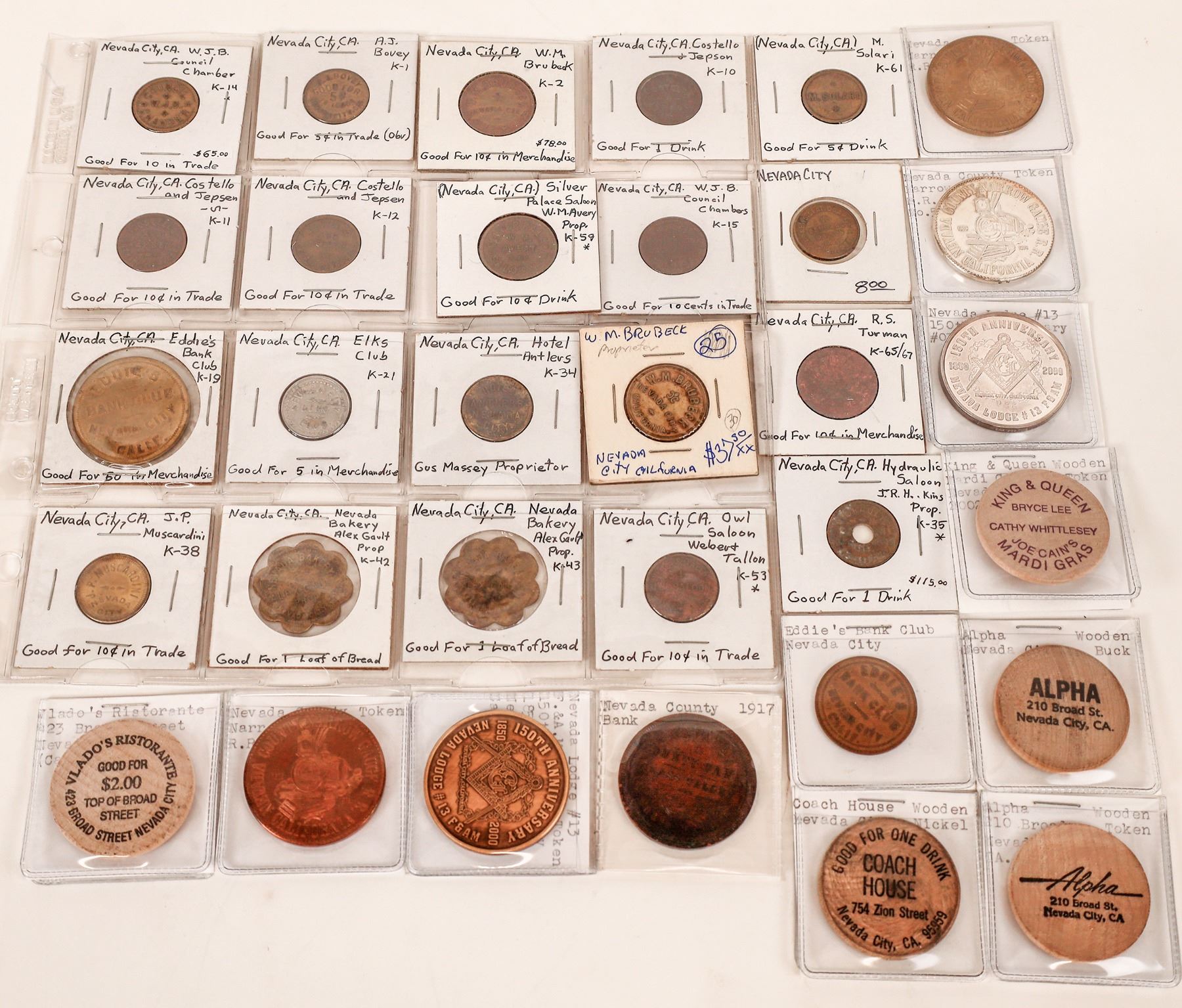 31 Nevada City tokens. 1.5" silver-Narrow Gauge Railroad, Nevada Lodge #13. Wood-Coach House, 2x Alpha, Vlado's Ristorante, Joe Cain's Mardi Gras. Metal-Nevada County Bank. Eddie's Bank Club, Hotel Antler's, Nevada Bakery etc. See photo. Nevada City California