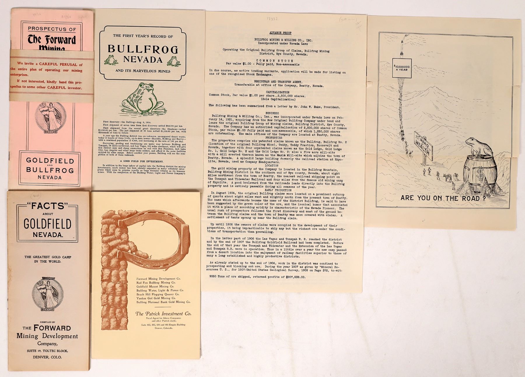 6. Prospectus of The Patrick Investment Company, printed in 1907 in Denver, 8 pages. 5x8". The company promoted the Forward MC, Red Fox Bullfrog MC, Goldfield Mascot MC, Bullfrog Water, Light and Power Co., Beach Hill Flagging Quarry Co., Yankee Girl Gold MC and Bullfrog National Bank Gold MC. James Patrick was president and his brother L.L. Patrick, a famous mine promoter, was on the board. Very fine Condition.