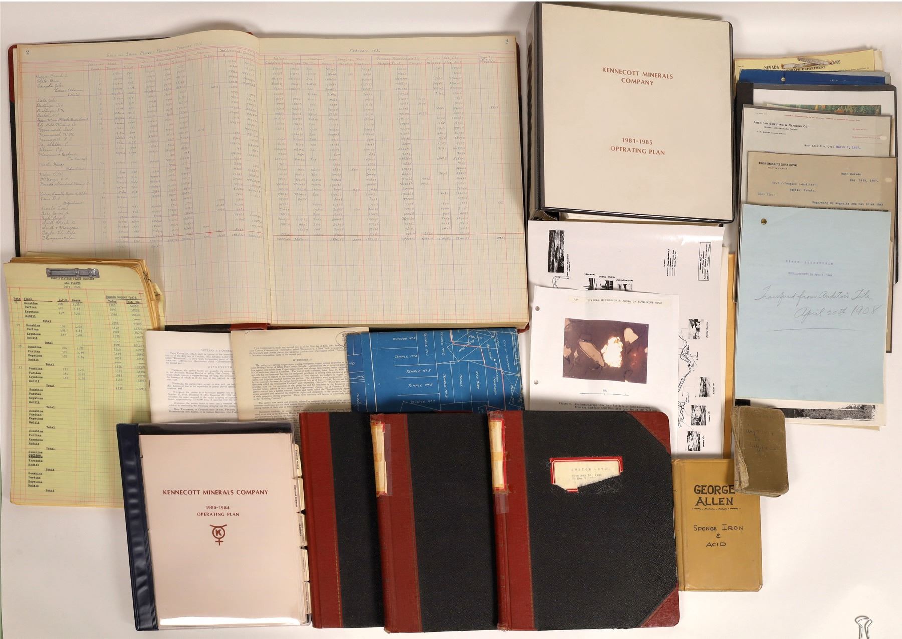 A variety of ledgers, notebooks, and documents of historical, geological, and metallurgical noteworthiness from the Nevada Consolidated Copper Corporation (NCCC) and Kennecott Copper Corporation (KCC), which purchased NCCC in 1932: 1) Large KCC ledger book, 15 x 17 inches, recording monthly purchases of precious metal-bearing fluxes and copper ore for the McGill smelter from January 1936 to December 1939. Each record includes the shipper (individuals and mining companies), wet pounds, assays, processing and other costs, freight charges, and mine royalties. Beautiful for the handwritten figures made in ink with no erasures. 2) KCC ledger book, spine labeled CUSTOM LOTS (4) May 26, 1939 to May 3, 1940, and CUSTOM LOTS (5) May 2, 1940 to February 19, 1941. Records the origin of custom ore lots received from various small miners including the Date of Receipt, Assay Date, Au, Ag, SiO2, Fe, CaO, Al2O3, S, and H20 values for that ore. These ledgers are a great chronicle of small mine production in Nevada and the Western US. 3) KCC ledger recording Molybdenum Plant Production at the McGill facility from Sep 20, 1940 to July 31, 1945. This provides a glimpse into the molybdenum supply during WWII when the US was using moly instead of tungsten in steel production. 4) Two, three-ring notebooks: Kennecott Minerals Company 1980-1984 Operating Plan and the 1981-1985 Operating Plan. Each includes sections on financial, operational, and environmental issues. 5) Two 1944 contracts between KCC and Consolidated Coppermines Corporation regarding the ability of both companies to adequately mine their respective, separate holdings in the open-pit copper mine adjacent to Ruth, Nevada. These specifically relate to the Liberty Pit and the Veteran Pit. Basically the contracts describe how each company can mine without adversely affecting the other company's ability to mine. 6) Undated NCCC diazo blue-line Property Map (claim map) of the Robinson Mining District at Ruth, Nevada. Hand drawn boundaries show locations of various waste rock dumps. Approx 55 x 27 inches, folded but in good condition. 7) A group of various NCCC and KCC correspondence, telegrams bound together with a Acco-type metal binder clip at the top. Subjects seem to center on refining contracts for the Steptoe smelter in McGill. 8) Two-page diazo blue-line chart comparing the mine and mill assays for the ore from the Veteran Mine. 9) presentation folder containing an artist's hand-painted color rendering of the open-pit mines of the Robinson Mining District and a black and white aerial photograph of the Nevada Copper Division (KCC) reduction plant (mill and smelter) in McGill. 10) Correspondence regarding the difference in tonnage charges between ores from Consolidated Coppermines and those from Giroux. 11) A folder of four, 11x4-inch color photographs: one showing 12 freshly poured and unmarked gold ingots, and three images of the Bingham Canyon open-pit copper mine. 12) looseleaf ledgers recording copper produced at the Sunshine, Puritan, Keystone, and McGill precipitation plants in 1948. 13) Personal logbook of F.A. Lawrence, 3 x 5 inches, Aug 7, 1934, to July 1935. 14) Personal logbook of George Allen, KCC employee. Starts with notes on what to do when coming on shift and includes many figures and notes about the operations of the acid plant, which captured sulfur dioxide gas from the smelter furnace and converted it to sulfuric acid. Includes a detailed sketch of the acid plant process flow. 15) 1907 correspondence between NCCC Auditor H. J. Douglas and Senator Simon Guggenheim of Colorado requesting his assistance in appointing a new postmaster for the McGill Post Office, and further requesting that the name of that Post Office be changed from McGill to Smelter!