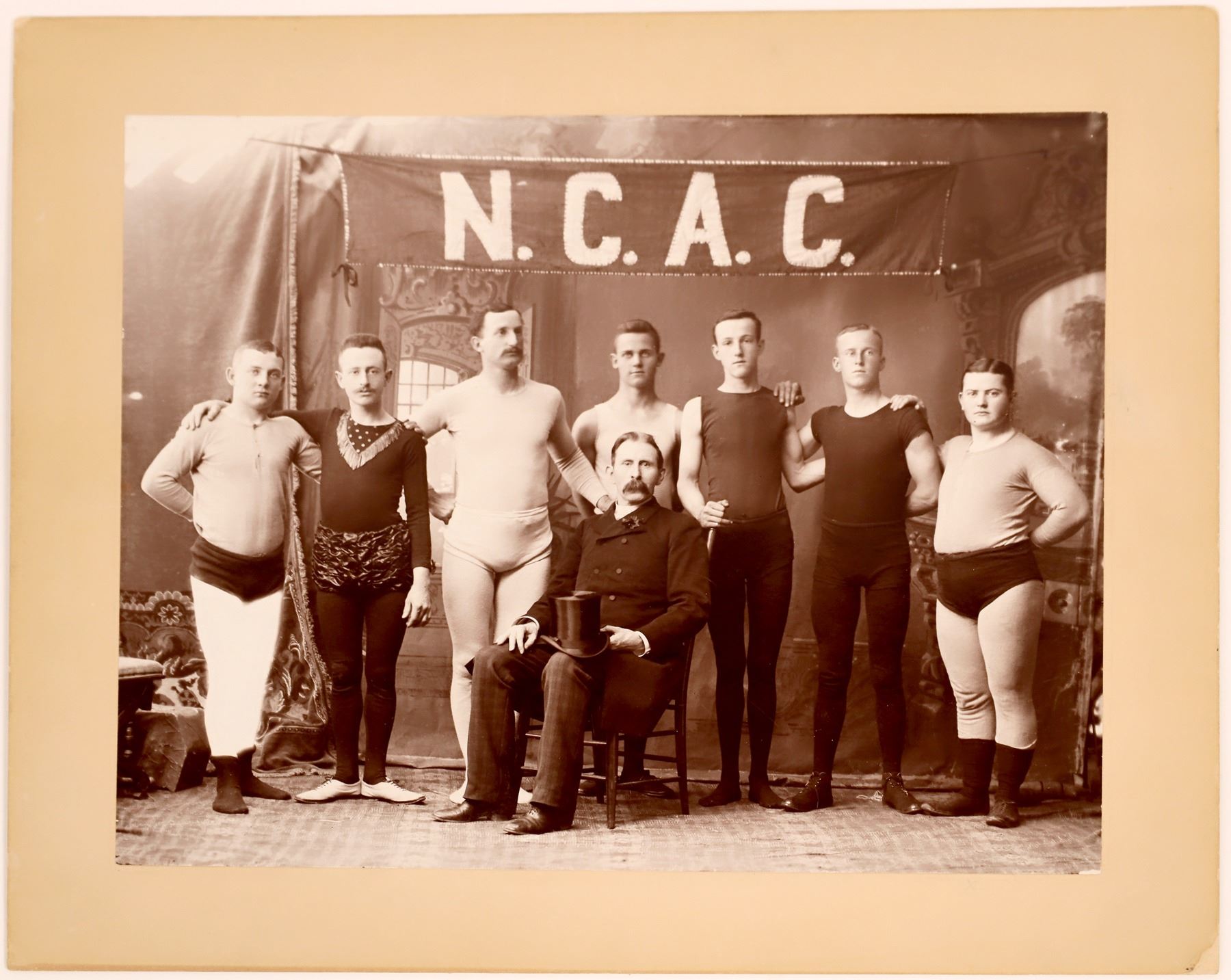 Vintage b&w photograph of N.C.A.C. - 7 men (boxers?) in training clothes standing in front of man (presumed coach) seated in chair. Nevada County Athletic Club photo, undated, c. late 19th century. Photo adhered to cardboard backing, placing inside plastic sleeve. Photo size +/- 8 3/4" x 7 3/4". Mounting board size 11 7/8" x 8 7/8". No tears, excellent condition Lot also includes a ticket to the 1871 Grand Gift Concert by the Grass Valley (CA) Benevolent Association held at Mt. Hamilton Hall, price $2.50. Size +/- 5 1/2" x 3", within plastic sleeve, no tears, excellent condition. Nevada County California
