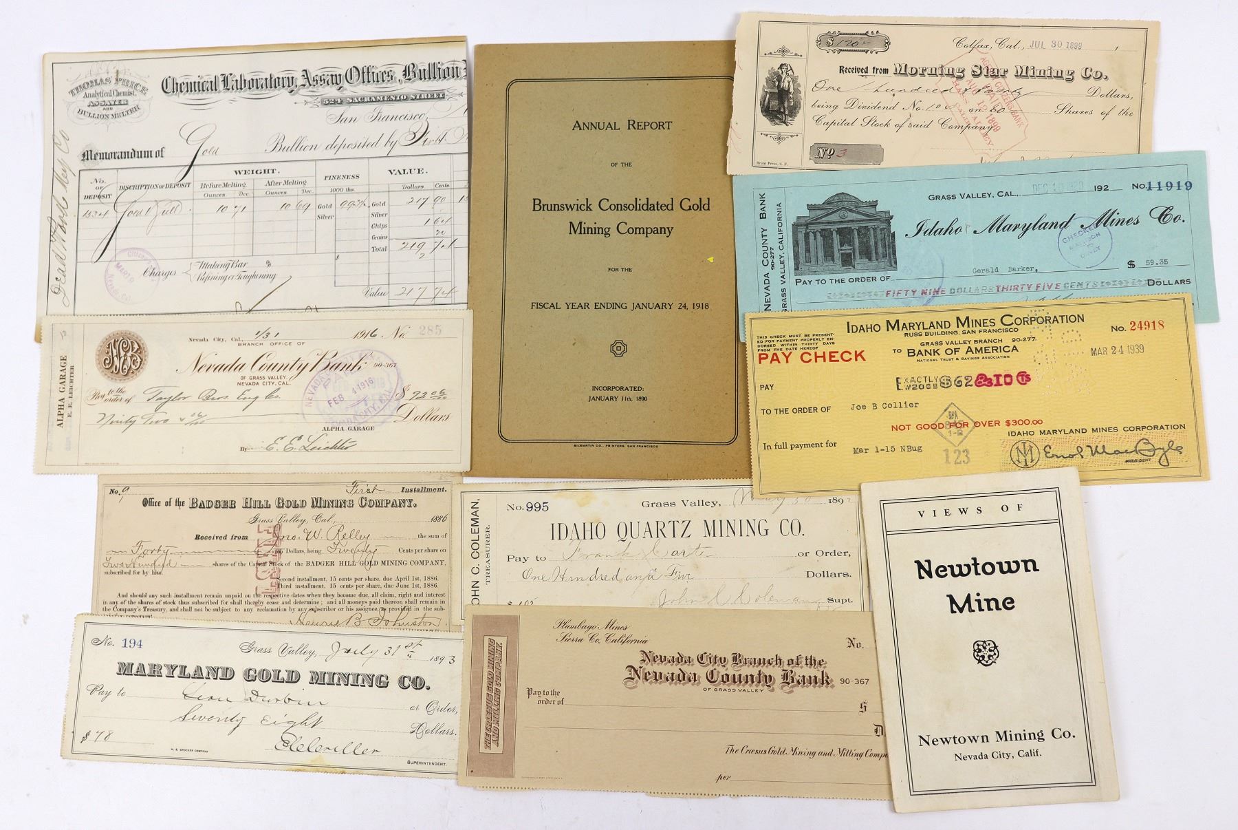 Lot of 11. Includes: 1880 Thomas Price Assay Memorandum for bullion deposited by the Deadwood Mining Co.; 1918 Annual Report of the Brunswick Consolidated Gold Mining Company; pamphlet of photos, "Views of the Newton Mine" (Nevada City); Morning Star Mining Co. dividend receipt, Colfax, 1899; Idaho Quartz Mining Co. check, 1892; Maryland Gold Mining Co. check, 1893; Croesus Gold Mining & Milling Co. check, unused; Idaho Maryland Mines Corp. pay check, 1939, and 1923 check;Alpha Garage check, 1916, Nevada City; and Badger Hill Gold Mining Company receipt, 1886. Nevada County California 1880-1939