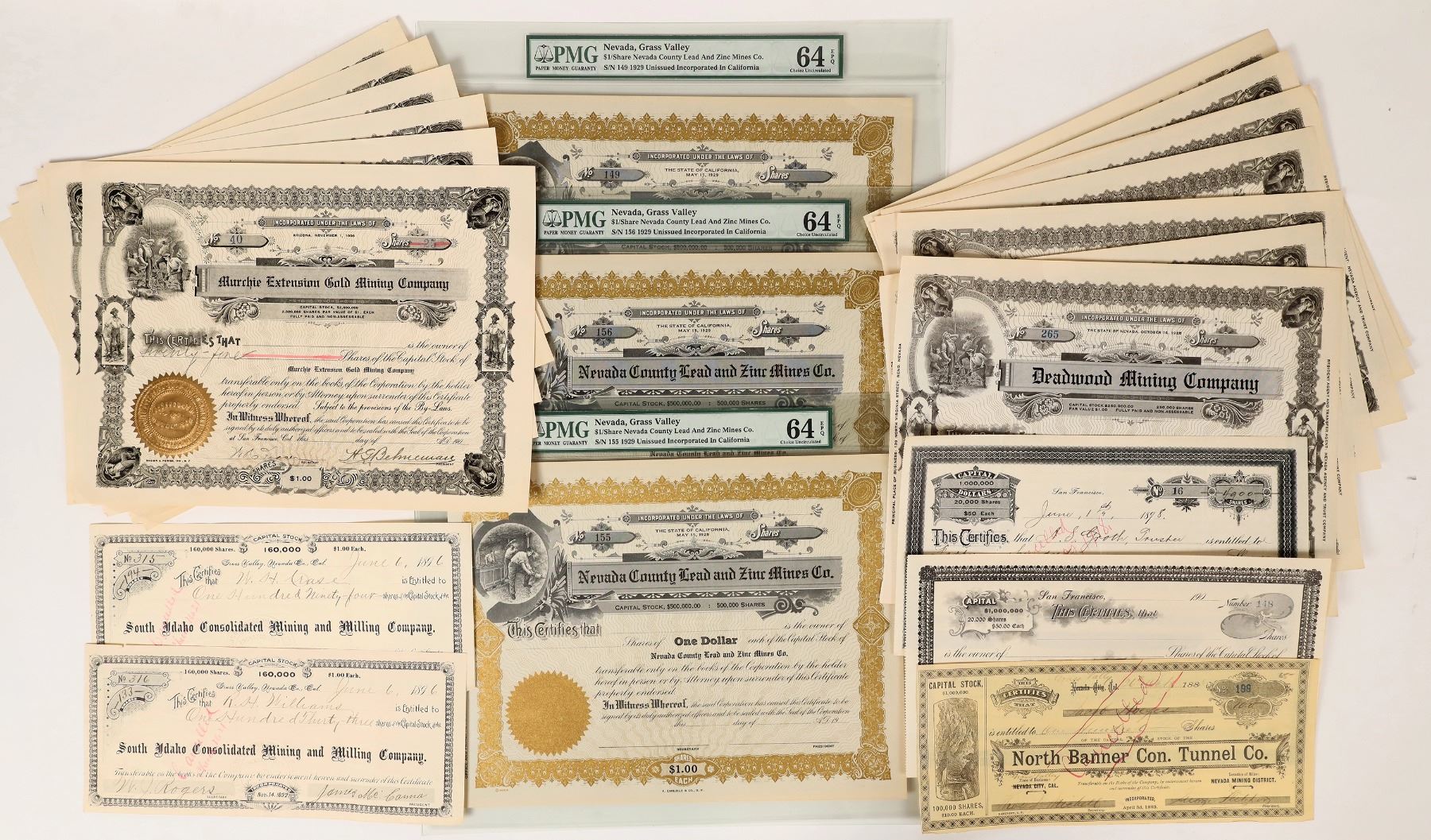 Lot of 21. Mix of issued and unissued. Includes: North Banner Con. Tunnel Company (1885); South Idaho Cons. Mining & Milling Co. (2 stocks, Grass Valley, 1896); Murchie Extension Gold Mining Company (6 stocks, signed by corporate offices but not issued, Nevada City, c.1906); Deadwood Mining Company (7 unissued stocks); Columbia Hill Gold Mining Co. (1898 and uniss.); and Nevada County Lead & Zinc Mines Co. (3 unissued stocks in PMG holders).