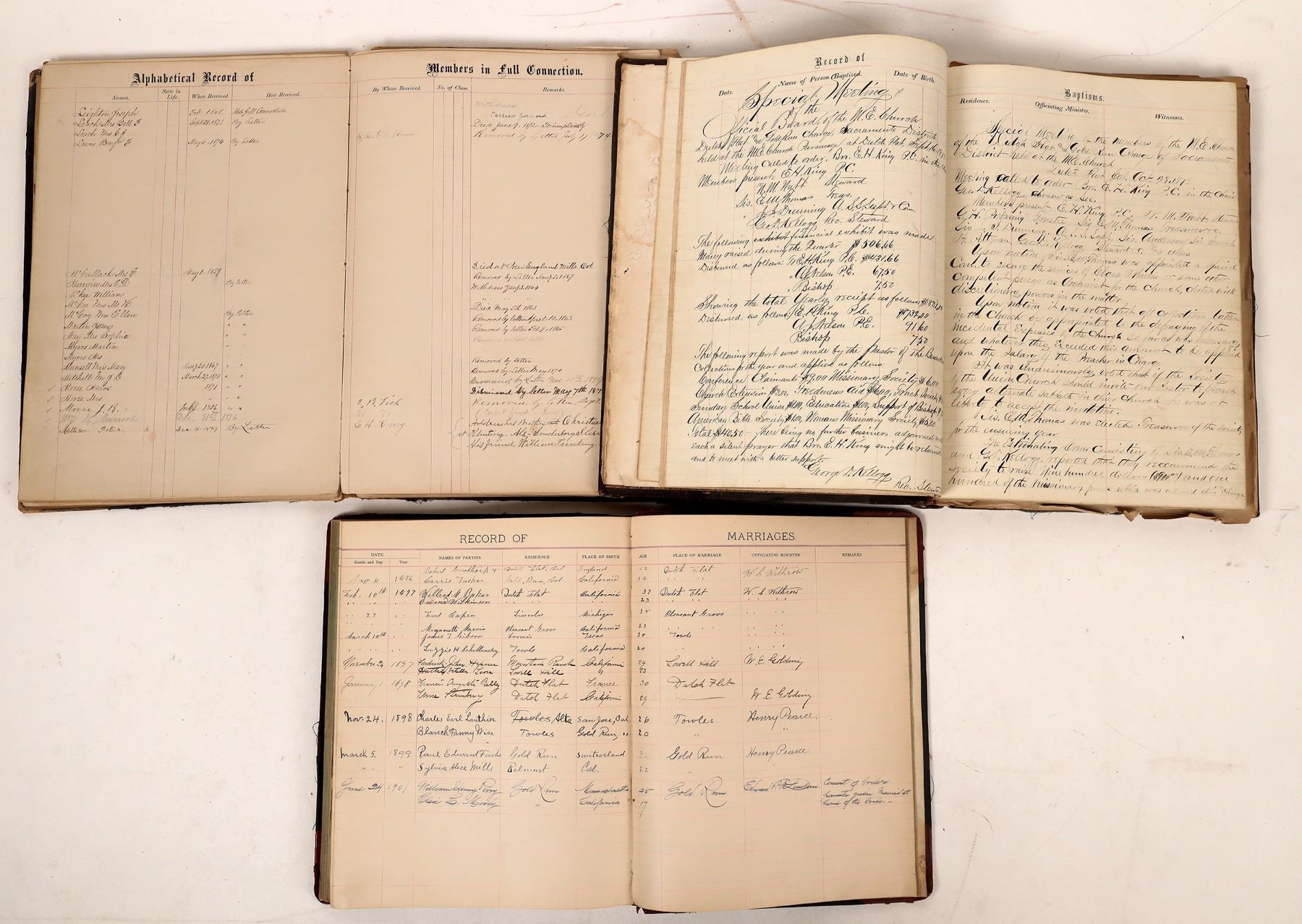 3 volumes of Methodist Episcopal church records c. l875-99. 1 volume has loose pages and detaching spine and boards. Includes marriages, church records, births, baptisms etc. in Dutch Flats, Gold Run etc. From the Nicholls Estate in Dutch Flat. W P Nicholls Bank was established in 1860 in Dutch Flat and remained in business until 1912. Since they were important citizens it is not unusual that these records were part of their estate. Nevada County California