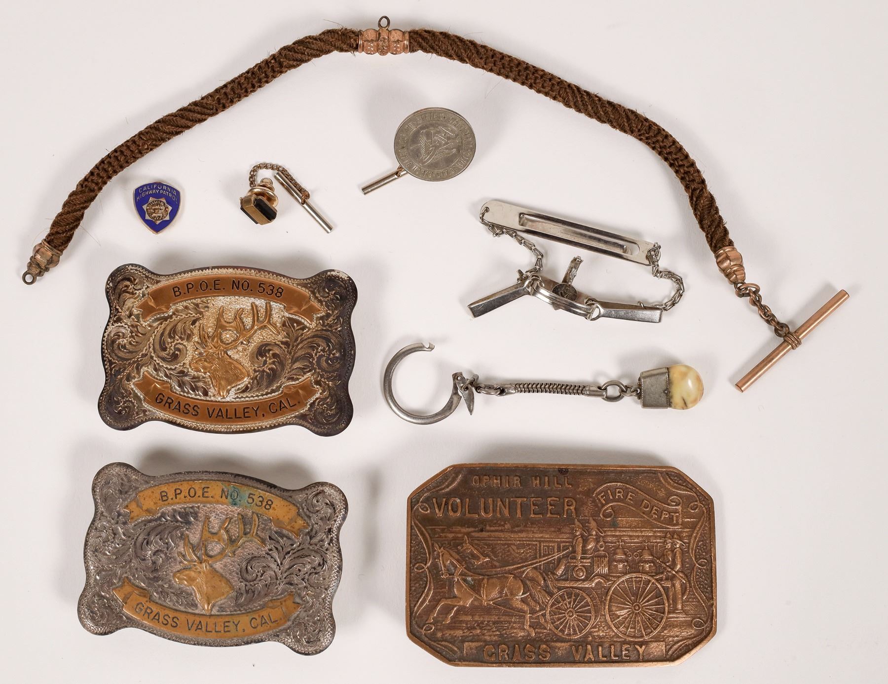 CA Division of Highways tie tack, BPOE key fob with stone, black stone tie tack, hair band, 2x BPOE 538 Elks belt buckle, Ophir Hill volunteer FD Grass Valley belt buckle.
