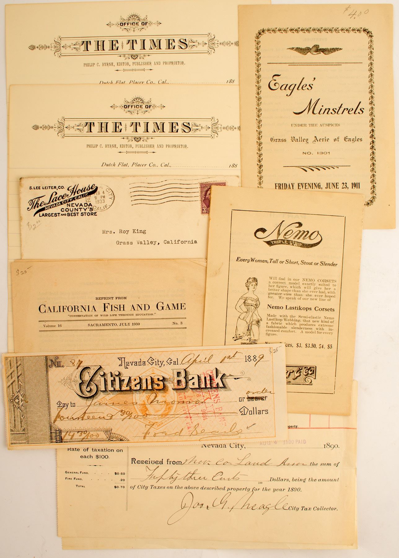 Lot of thirty-two. Includes 8x10 photograph of the Grass Valley Fire Department. Pictorial billheads for WJ Wilson, 189- Newcastle; three J Hennessey Empire Livery stable, pink and green, Nevada City with trotting horses racing; James Cairns, 1889, horse products with horse head pictorial; and two George E Turner, Hardware, 1890, with stove pictorial. Other billheads include Richard Noell hardware, Mt. Oro Lumber, George Gaylord groceries, Wiesenburger Brothers feed store, Nevada County Electric Power, Howell & Cassidy plumbers,George Allen foundry, three unused The Times of Dutch Flat, and a cute cartoon Dudley Eldridge 1943 plumber. Also an 1890 tax assessment, 1888 piano recital program, Eagles' Minstrels 1911 program, and California Fish & game brochure on feeding pheasants and quail, Checks include Idaho Maryland Mines, North Star Mines, Rainbow Account, Washington Mining Company of 1881, and Idaho Quartz Mining Company. State: California City: Nevada County HWAC#: 48819 Date: 1875-1943