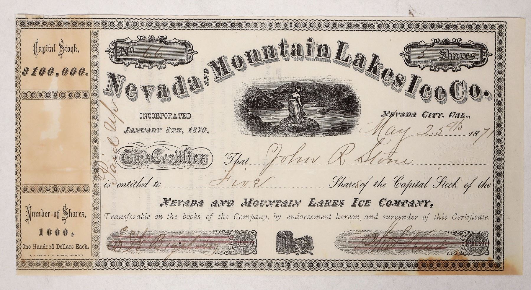 A stock certificate for five shares in the Nevada and Mountain Lakes Ice Company, dated 1871. No. 66 issued. After its 1870 incorporation in Nevada City, the company harvested ice in the Sierra Nevada mountains for delivery to saloons, bars, and hotels in the San Francisco area. The certificate is made out to John R. Store and signed by the company's secretary and president. It has an embossed company seal on the right side and a vignette of a female figure overlooking a mountain lake. Trimmed tight on left, some staining. Uncancelled.