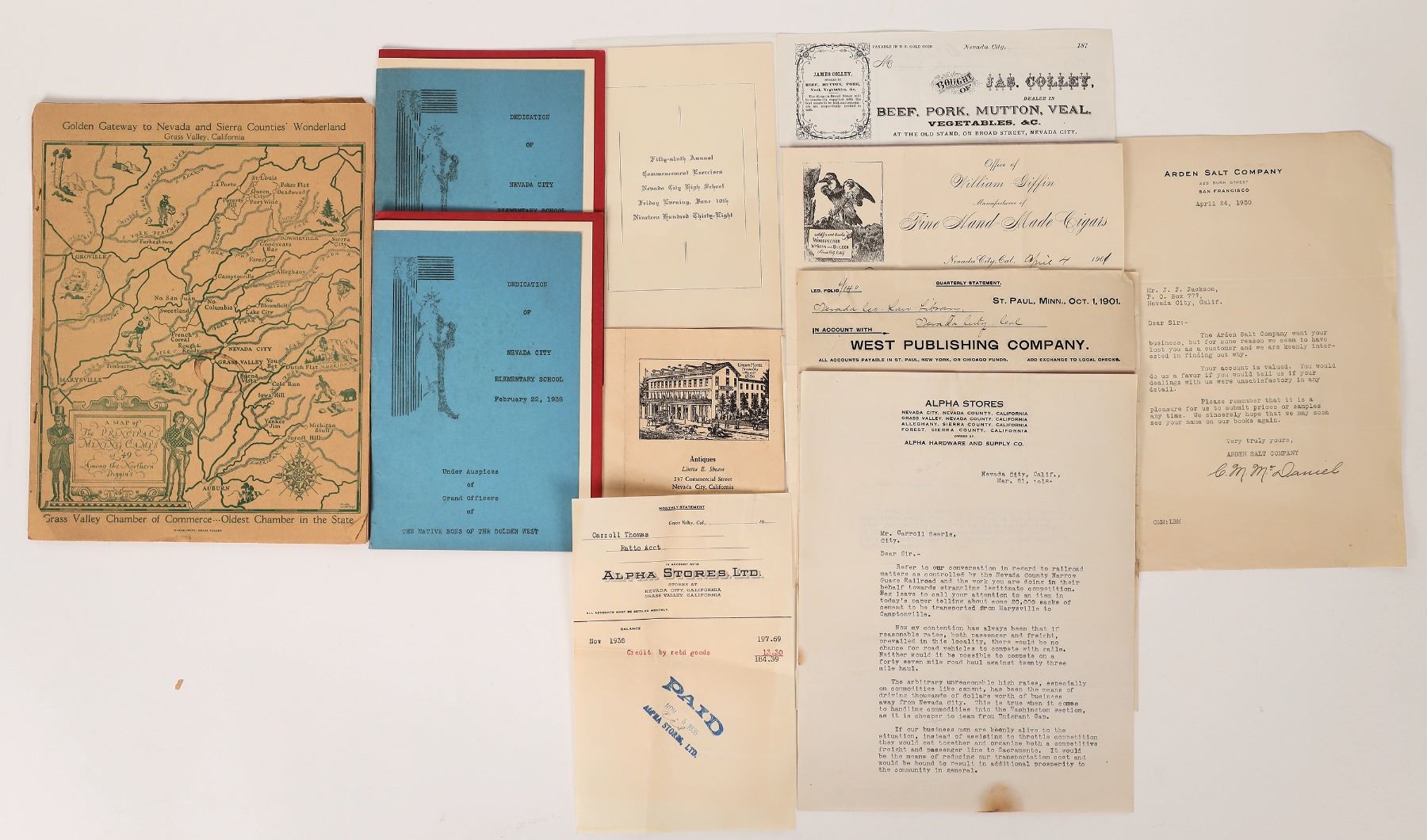 11 pieces of Nevada County ephemera. Grass Valley Gateway to Nevada and Sierra Counties Wonderland, 7 billheads and letterheads, 1938 Dedication of Nevada City Elementary School x2. California Nevada County