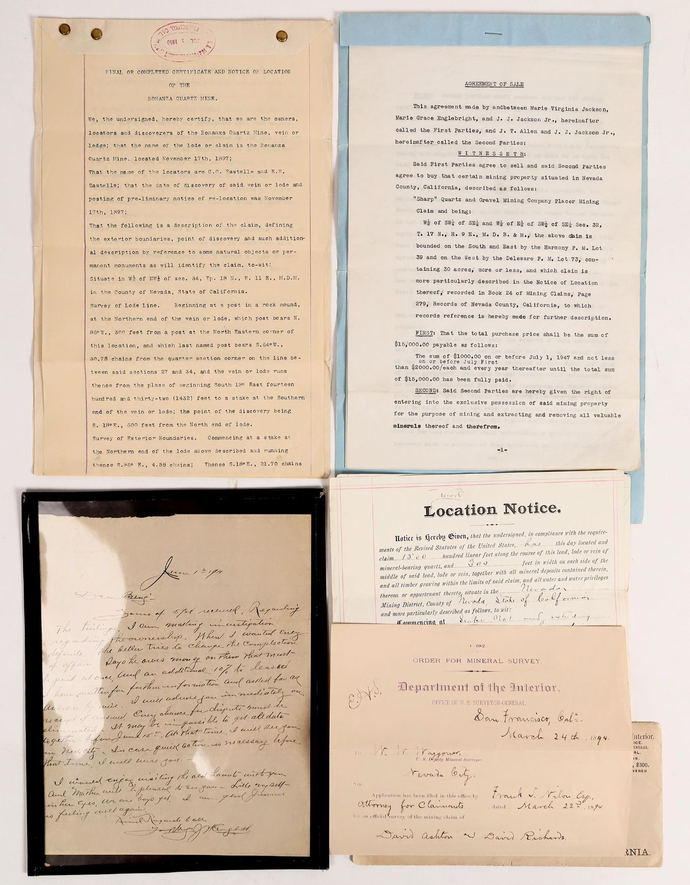 Five documents concerning Nevada County mining: 1) Final or Completed Certificate and Notice of Location of the Bonanza Quartz Mine, recorded July 1, 1899 by C. O. & E. W. Sawtelle. 2) June 1, 1914 letter to acquire interest in a Nevada City mine, probably with the seller. "Every chance for dispute must be eliminated,". 3) 1894 Location Notice for the Chile Mine. 4) 1945 Agreement Of Sale for the "Sharp" Quartz and Gravel Mining Company for $15,000. 5) 1894 Order For Mineral Survey from the Department of the Interior, office of U. S. Surveroy-General W. W. Waggoner for the Little Dove Quartz Mine in Nevada County. In original envelope from the Department of the Interior San Francisco to Waggoner in Nevada City.