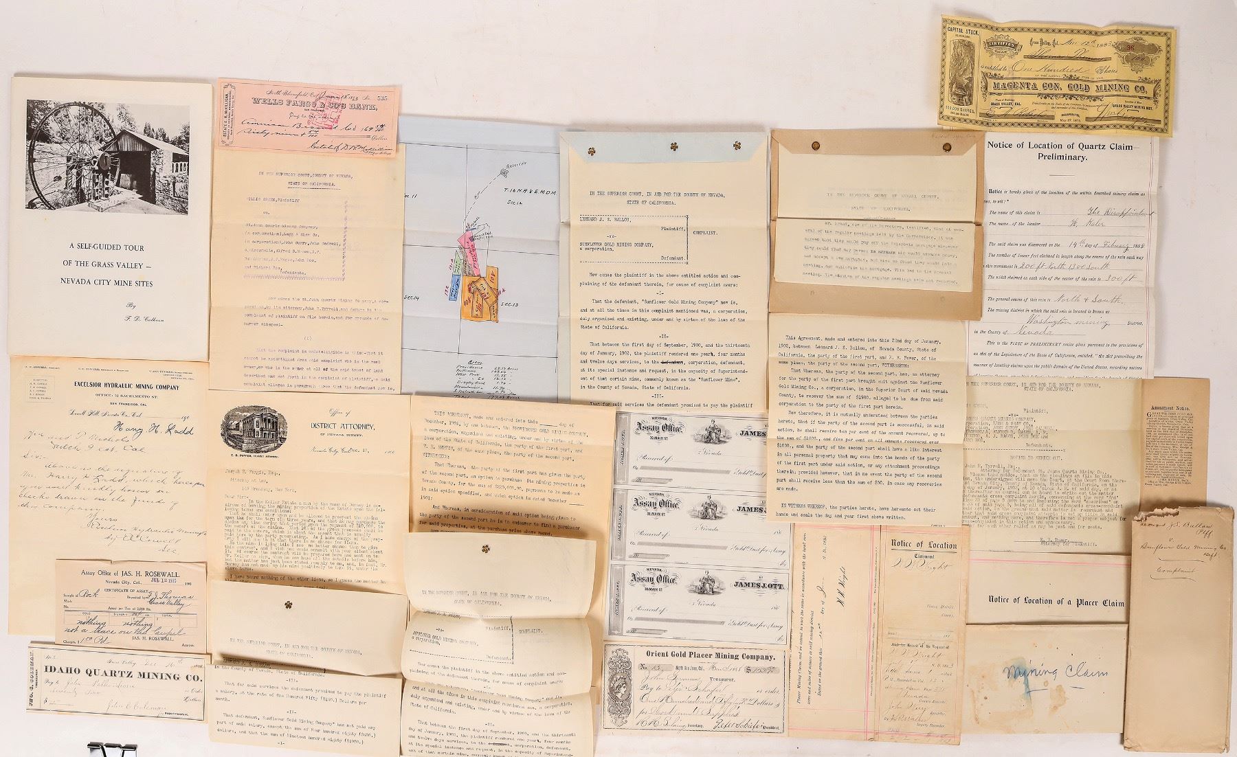 About 18 pieces of Nevada County mining ephemera, c. 1860-1905. Legal docs, assay card "not a trace on this cupel." Magenta Con. Gold 1883 stock. Hand drawn color claim map. Location of a placer claim. Letterhead, checks etc. Nevada County California