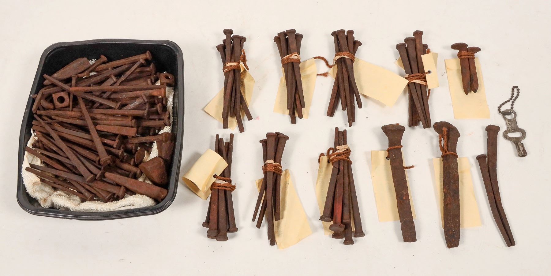 Collection of square configuration nails and spikes for mining operations, from Nevada County California. Multiple sets, various sizes. Largest spikes measure 6" long, larger nails are similar. Square heads and shanks on all, grouped by sizes. (9) groups of various counts, please see photos.