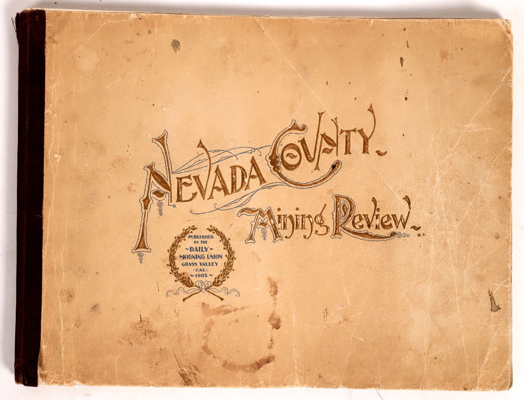 1895 Nevada County Mining Review with lots of historic mining photos. Mines include Omaha, Independence, Rose Hill etc. and hydraulic mining scene. 143pp plus advertisements. Front cover has tape repairs, back cover has corner chip. Both covers have stains, please inspect. 9x12".