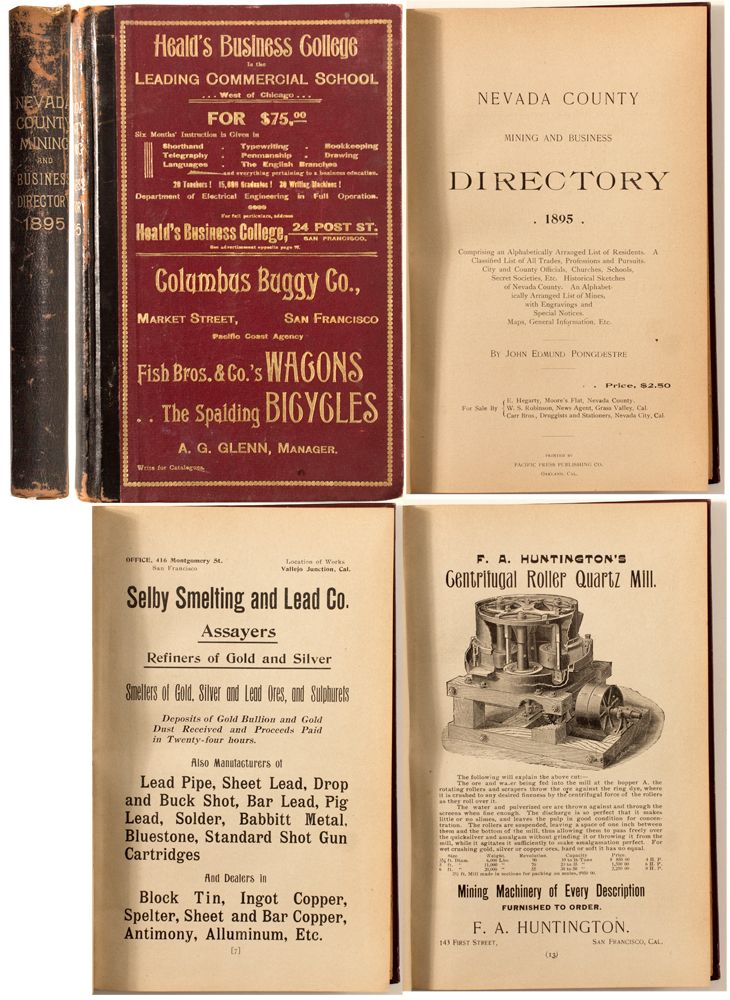 A second copy. Nevada County Mining and Business Directory, 1895, by John Edmund Poingdestre. Contains an index to contents; and an index to Nevada County, San Francisco, and Sacramento advertisers. Also lists residents alphabetically; classified list of all trades and professions, city and county officials, churches, schools, secret societies, historical sketches of Nevada County, list of mines, and maps. Hardcover, 240 pages, many advertisements, fine condition.