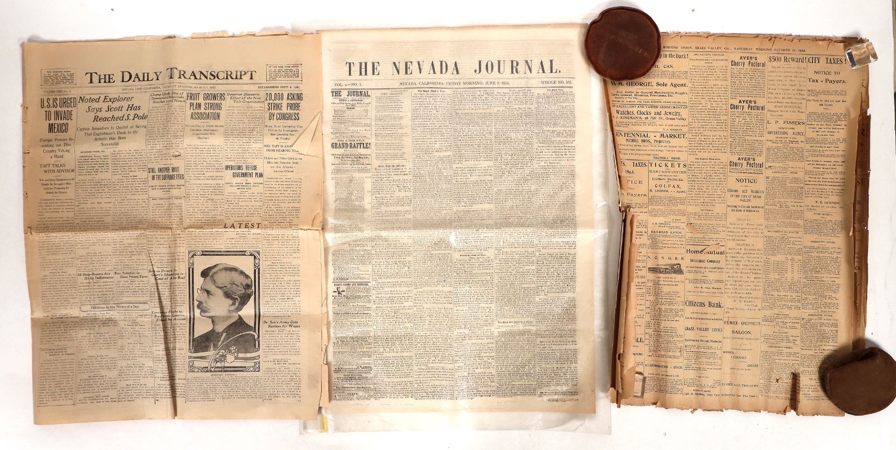 Nevada County, California newspapers (3), including two Nevada City papers "The Nevada Journal" (1854) and "The Daily Transcript" (1912) and a Grass Valley edition, "The Daily Morning Union" (1893).