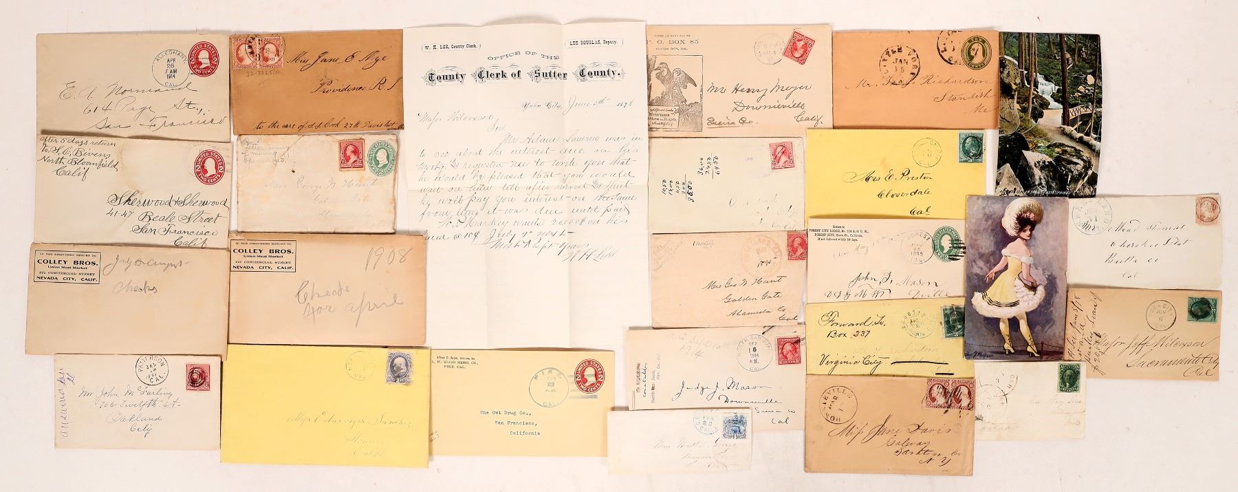 25 postal history mostly covers from Nevada County, c. 1879-1914. Forrest, Nevada City, North Bloomfield, Yuba City, Sweetland, Patterson, Alleghany, North Columbia, Pike, North San Juan, Downieville, Goodyears Bar, Little York, French Carral(sic). Nevada County California