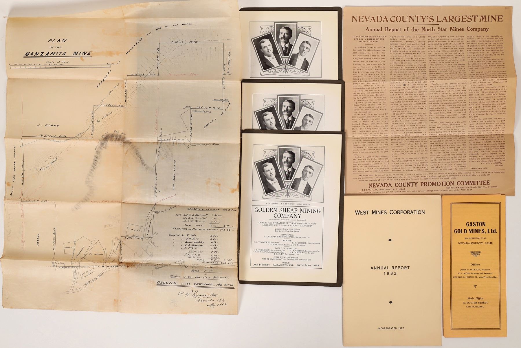 1) Map of the Manzanita Mine. 1882. 18x14”. 2-4) Golden Sheaf Mining Company. Located Michigan Bluff, Placer County. 15 photos. 16 pages. 5) Gaston Gold Mines. Washington, Nevada County. 8 page fold out. 6) North Star annual report. 1909. 7) West Mines Corporation. 12 pages. One map. Nevada County California