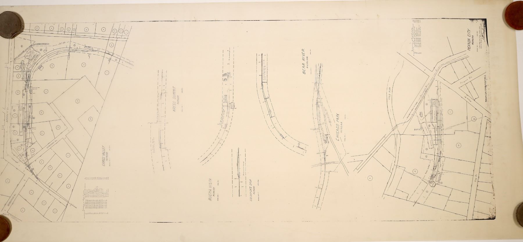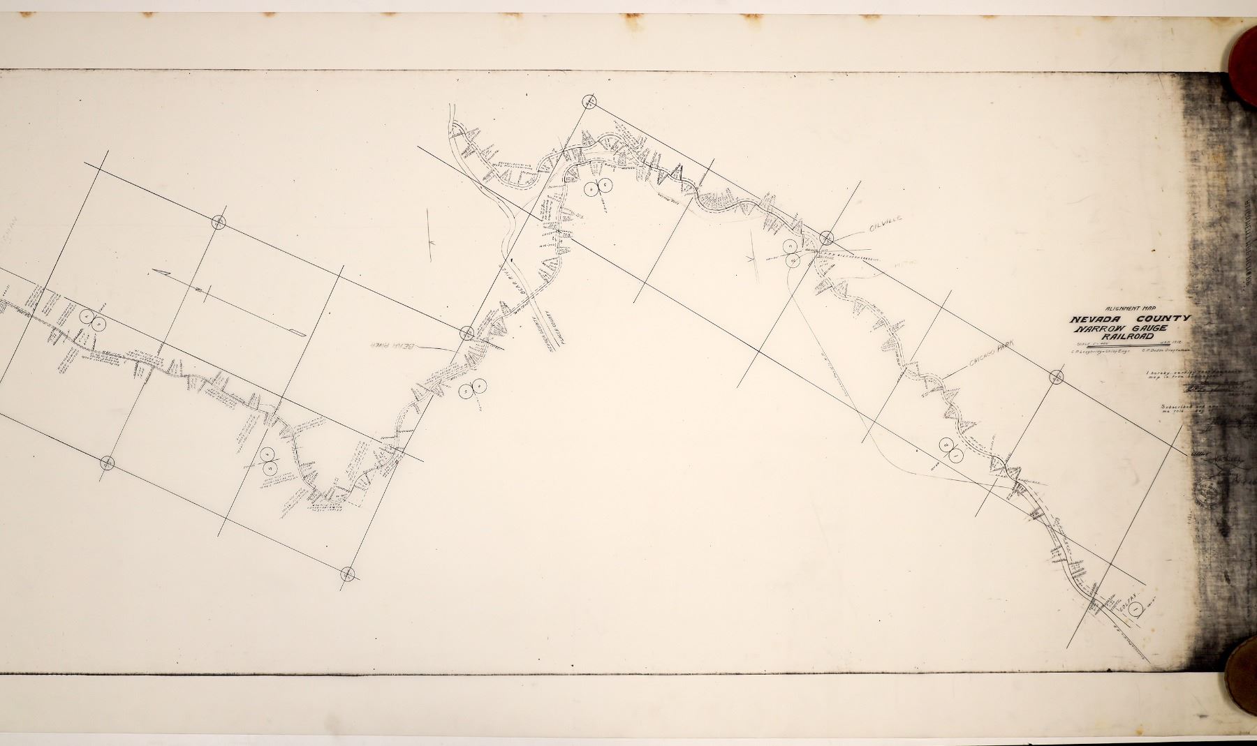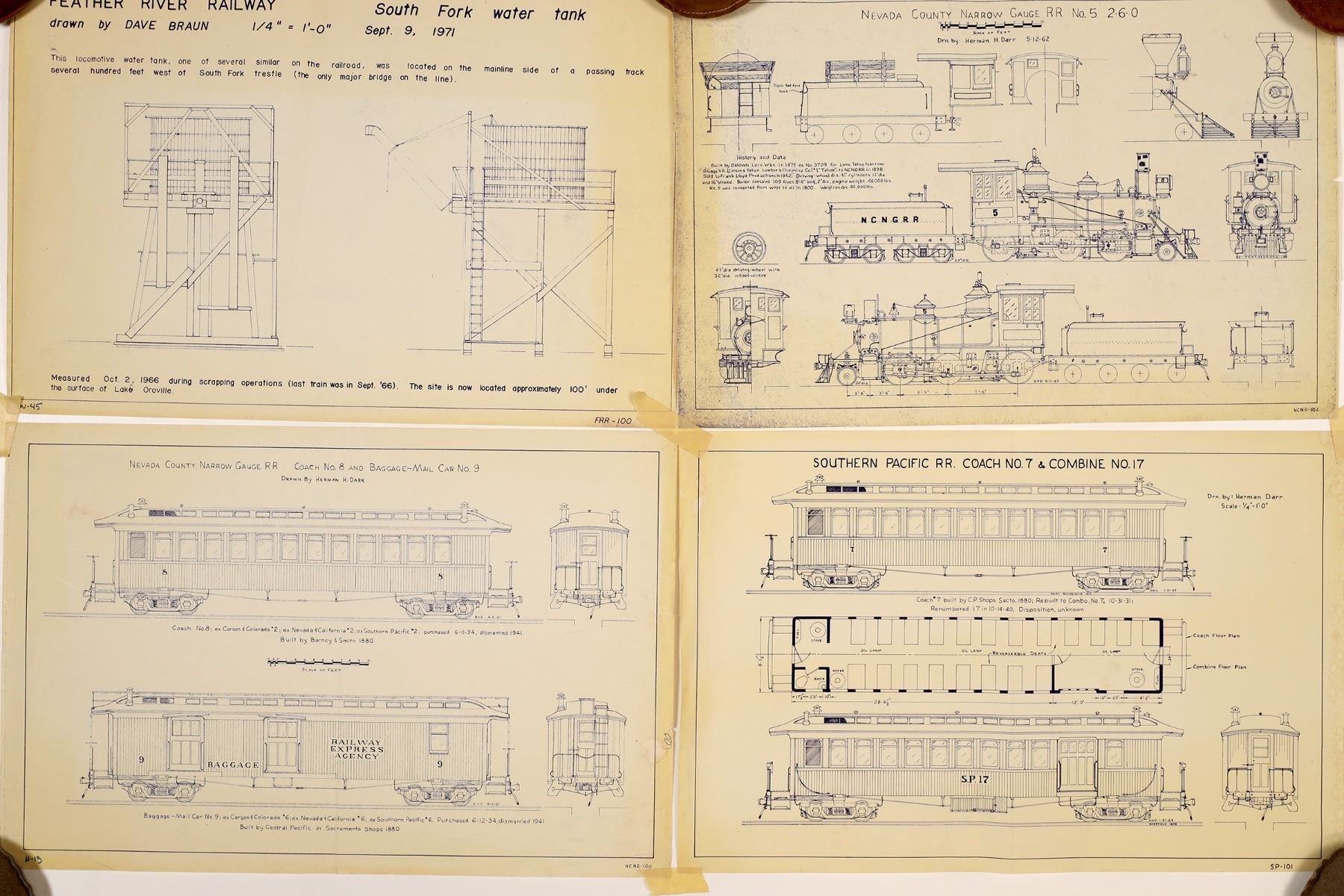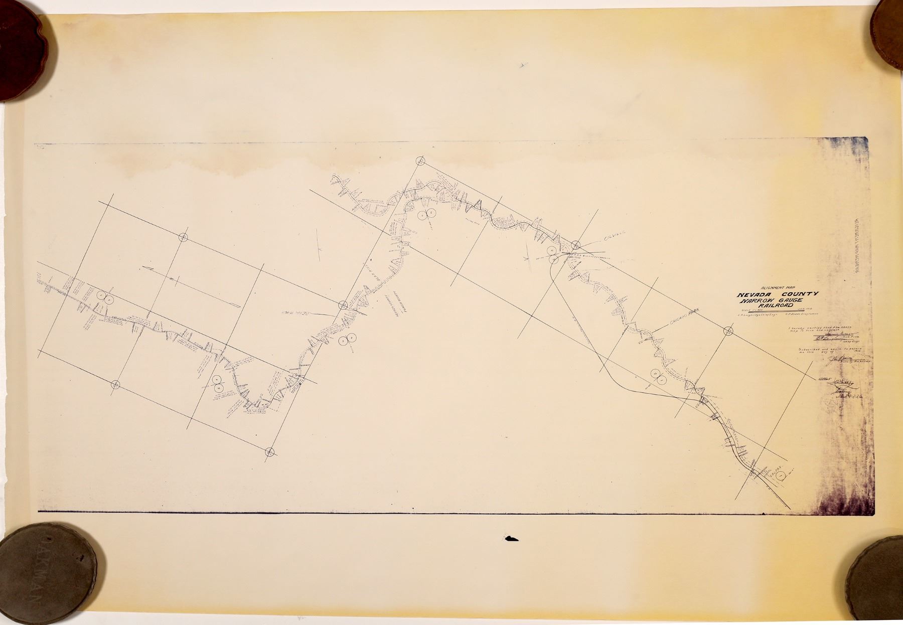 Nevada County, CA railroad maps. 4 about 25x36". 3 about 36x145". 20 smaller railroad car bule prints including narrow gauge railroad. Nevada County California