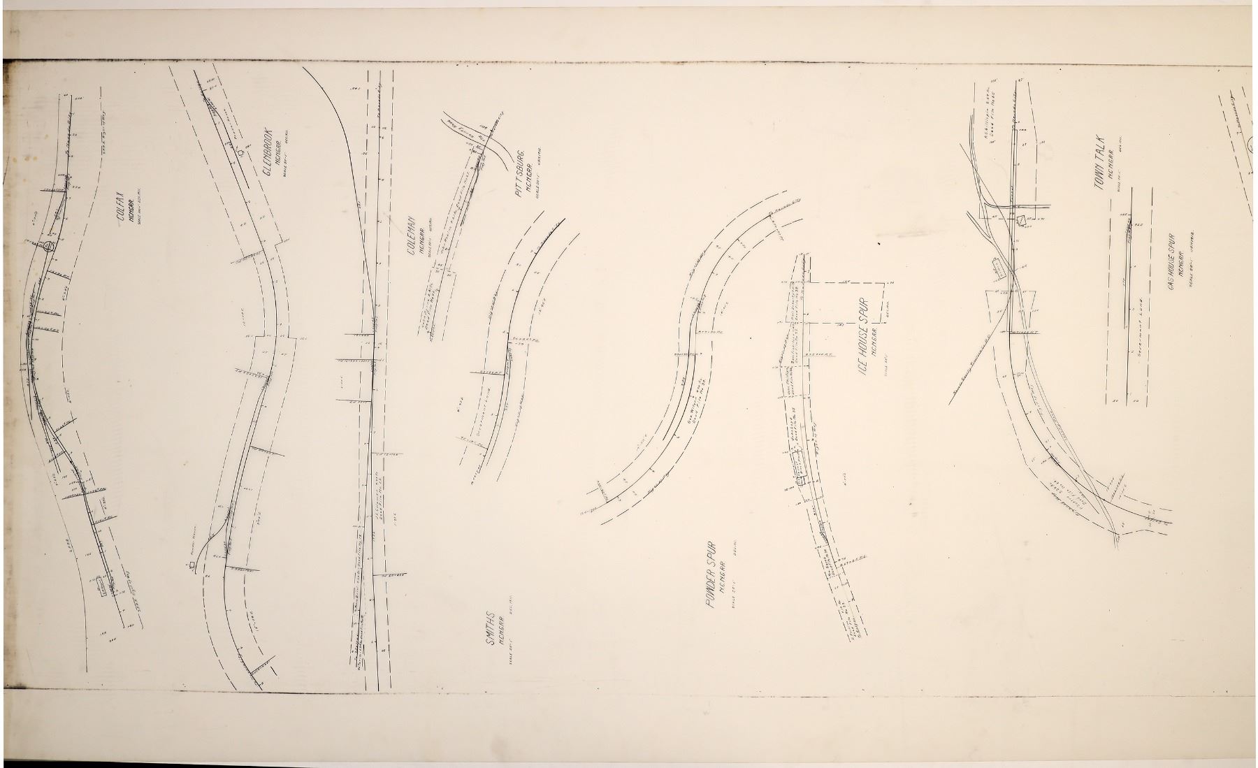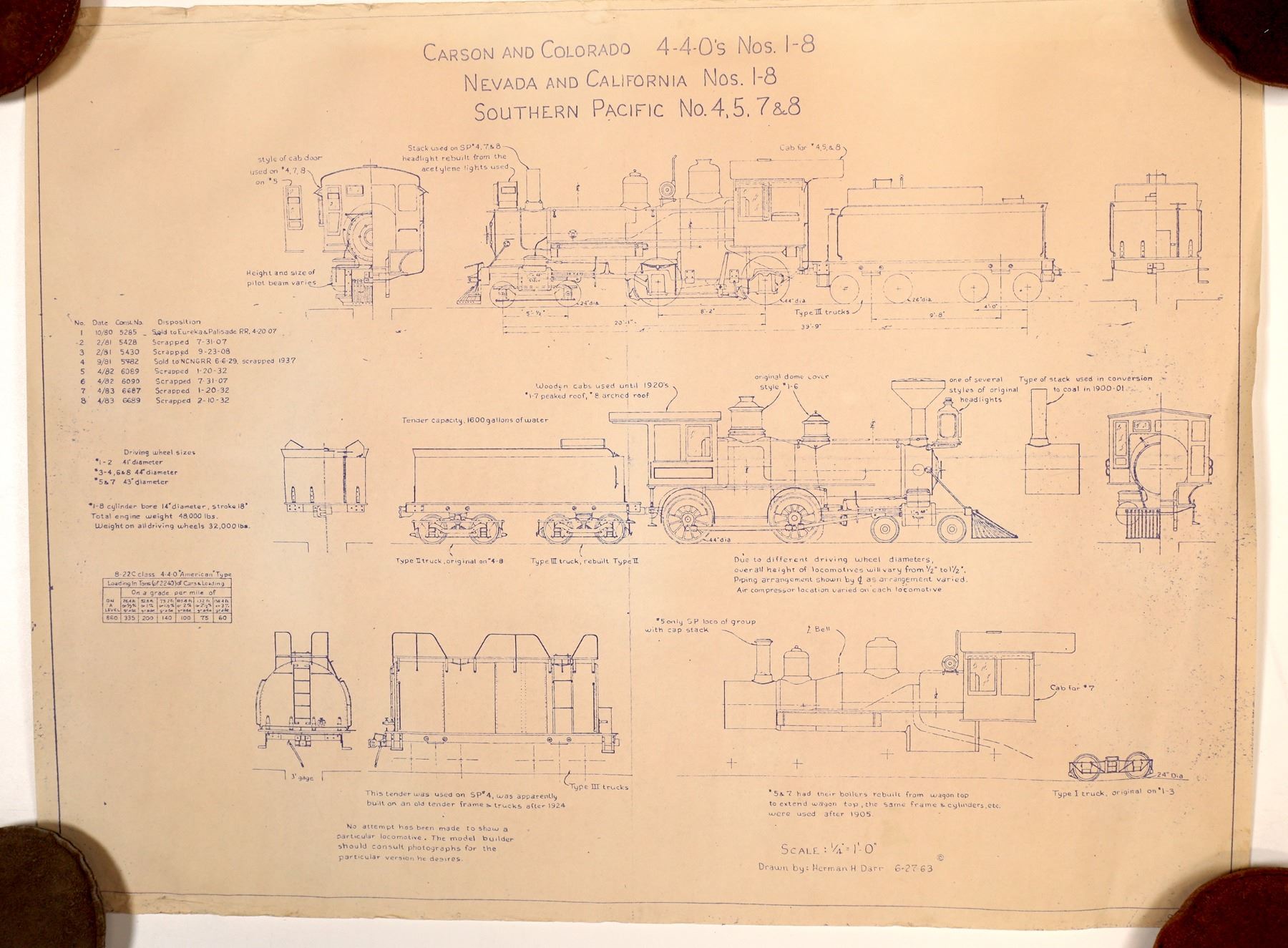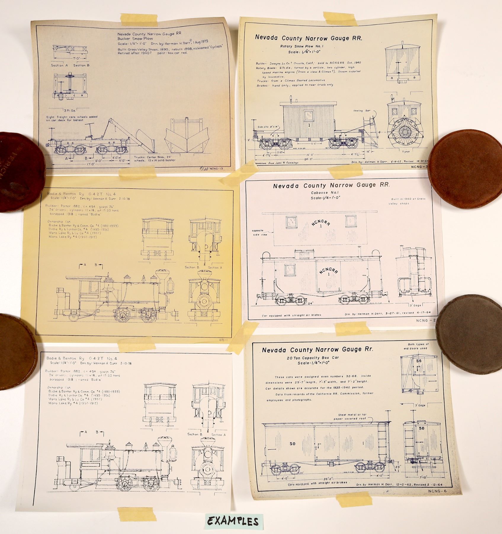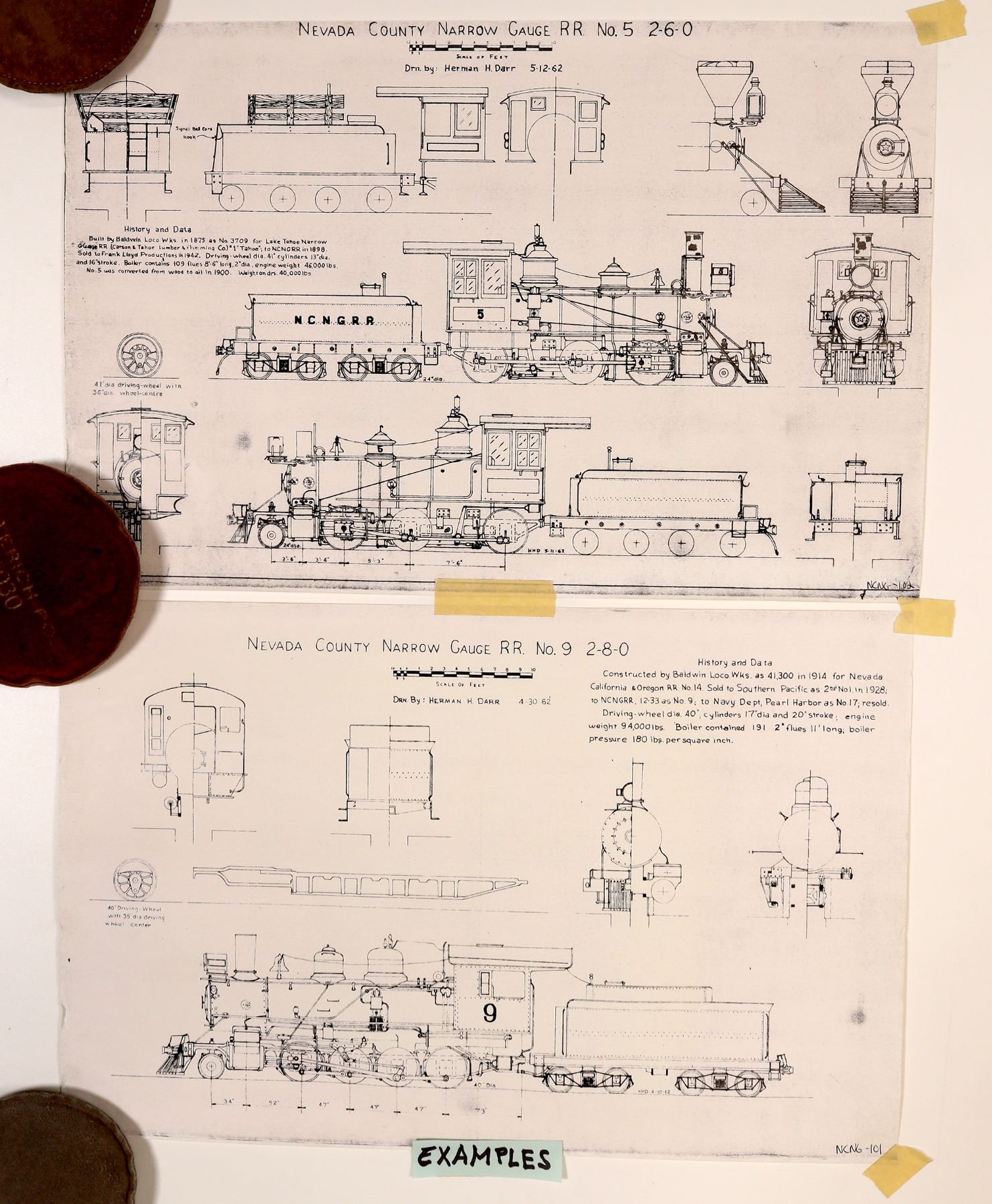 Nevada County, CA railroad maps. 4 about 25x36". 3 about 36x145". 20 smaller railroad car bule prints including narrow gauge railroad. Nevada County California