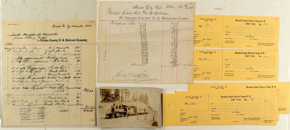 Nine pieces for the Nevada County Narrow Gauge Railroad. Includes: two billheads (Nevada City, 1884 and Grass Valley 1924), a real photo postcard mailed 1931 (creases and wear), and six unused trip pass receipts. (Prag Collection) City: Nevada County State: California Date: 1884-1931 hwac# 34149