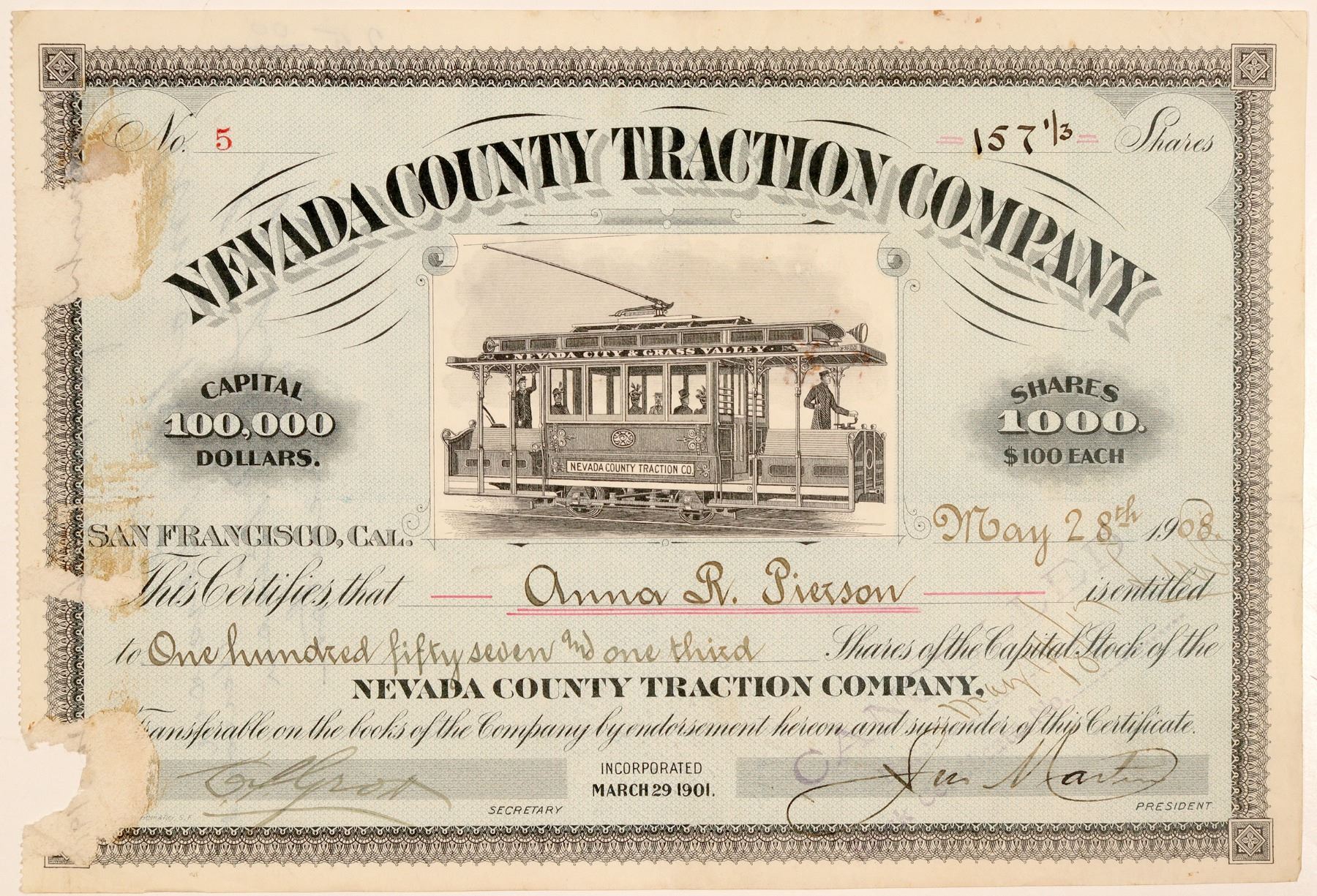 #5, I/U, 157 1/3 shares of 1000 authorized @ $100 par issued May 28, 1908 to Anna R. Pierson. BLACK w/blue underprint background. Vignette electric street car w/company name on side l-r. F-VF cond Ken Prag Collection