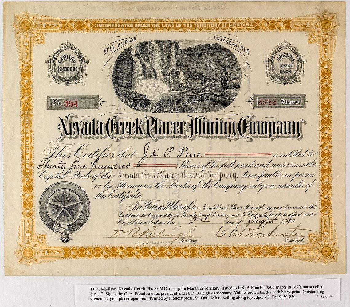 Number 394 for 3,500 shares to JKP Price. Outstanding vignette of gold placer operation. Minor soiling damage along top edge. Signed by president Proudwater and secretary Raleigh. William Raleigh was a Helena, Bozeman, and Great Falls, Montana Territory, merchant; and one of the owners of the Nevada Creek Placer Mining Company. The Nevada Creek property comprises some 600 acres of ground situated on the east side of Nevada Creek in the great Blackfoot placer district. It is along the western face of the main range four miles south of the Big Blackfoot and thirty five miles northwest of Avon on the Northern Pacific. Operations in the past have been on a limited scale owing to the lack of sufficient water supply to fill the twenty five miles of ditches owned by the owners of the ground and work could only be prosecuted from two to three months of the year but it has now been arranged to largely increase the water supply so that work can be conducted on a large scale for seven months out of the year and the yield will thus be proportionately increased [E/MJ, Engineering and Mining Journal, Volumes 43-44]. City: Nevada Creek, Powell County State: Montana Date: 1890 ID: 36255