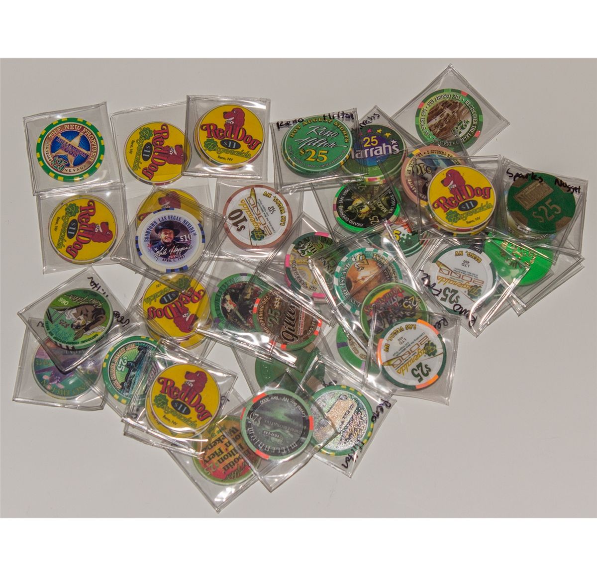 Lot of 48. Most are commemorative chips. From Reno: Hilton (eleven $25 chips (Hot August Nights, Air Races, Street Vibrations), Mapes (3 different styles), Harrah's (two Planet Hollywood Grand Opening), Fitzgeralds (Millennium). From Sparks: Nugget ($25 brass core). From Vegas: Aladdin (two $25 chips), Arizona Charlie's ($10), Boomtown ($10), Caesars ($25 Magical Empire), Desert Inn ($25), Fitzgerald's (two $10, one $25, eleven $11 Red Dog chips), Fremont ($25 Millennium), Gilley's ($25 grand opening), Golden Nugget (two $25 Millennium chips), Mahoney's Silver Nugget (4th of July $25), New Frontier ($25 Millennium), and Treasure Island ($25). From Tahoe: Biltmore (two $25 Millennium chips).City: County: State: NVDate: