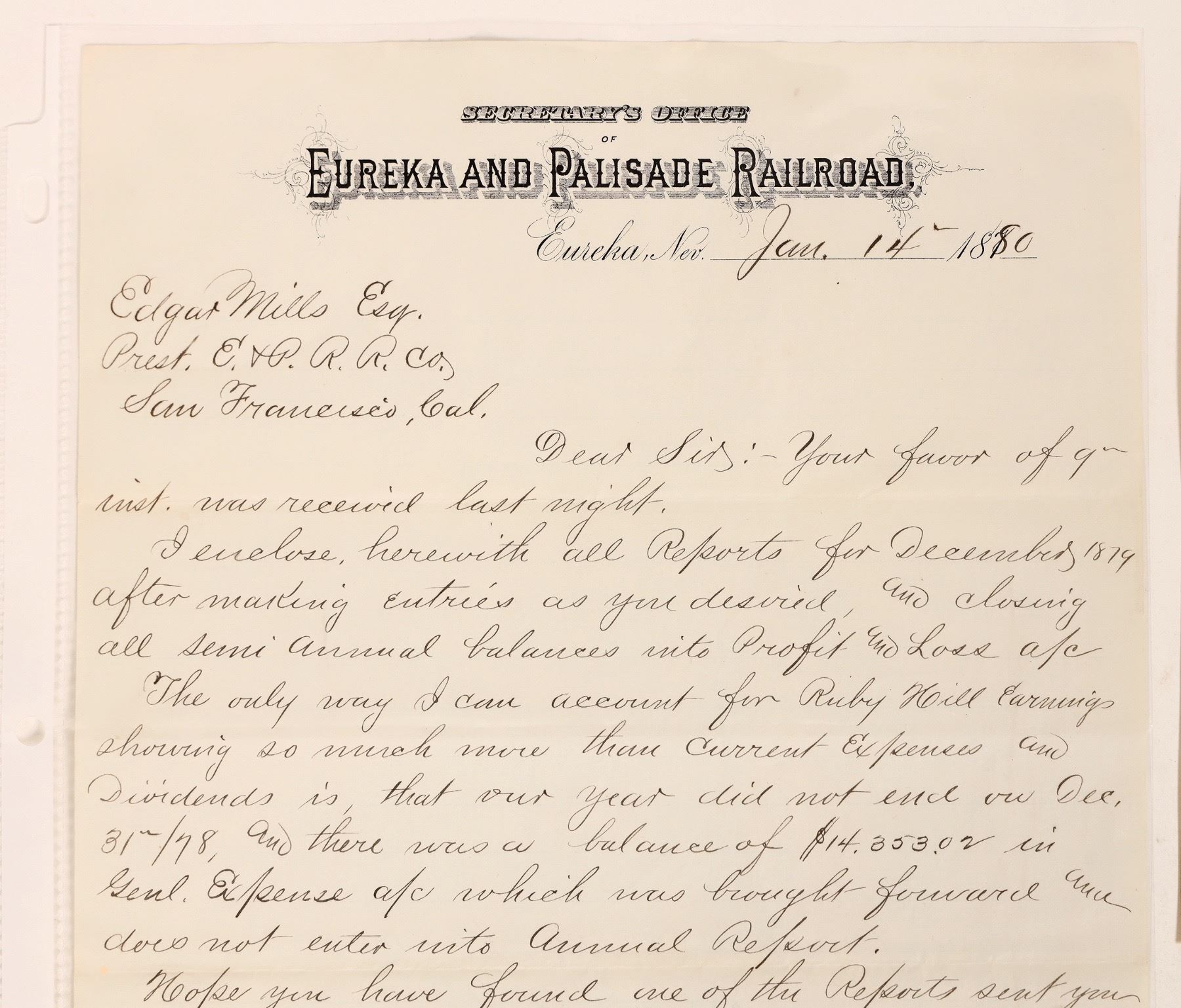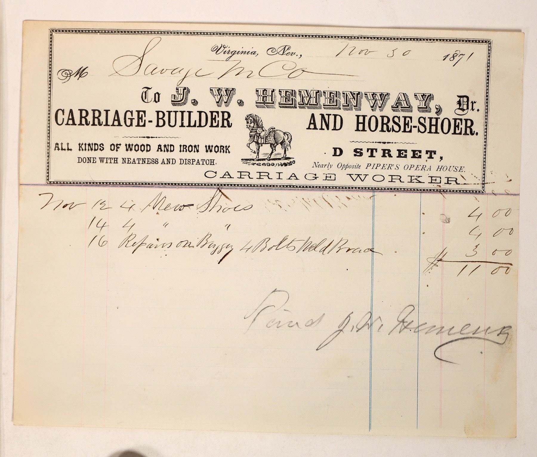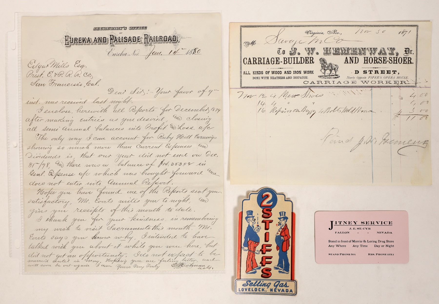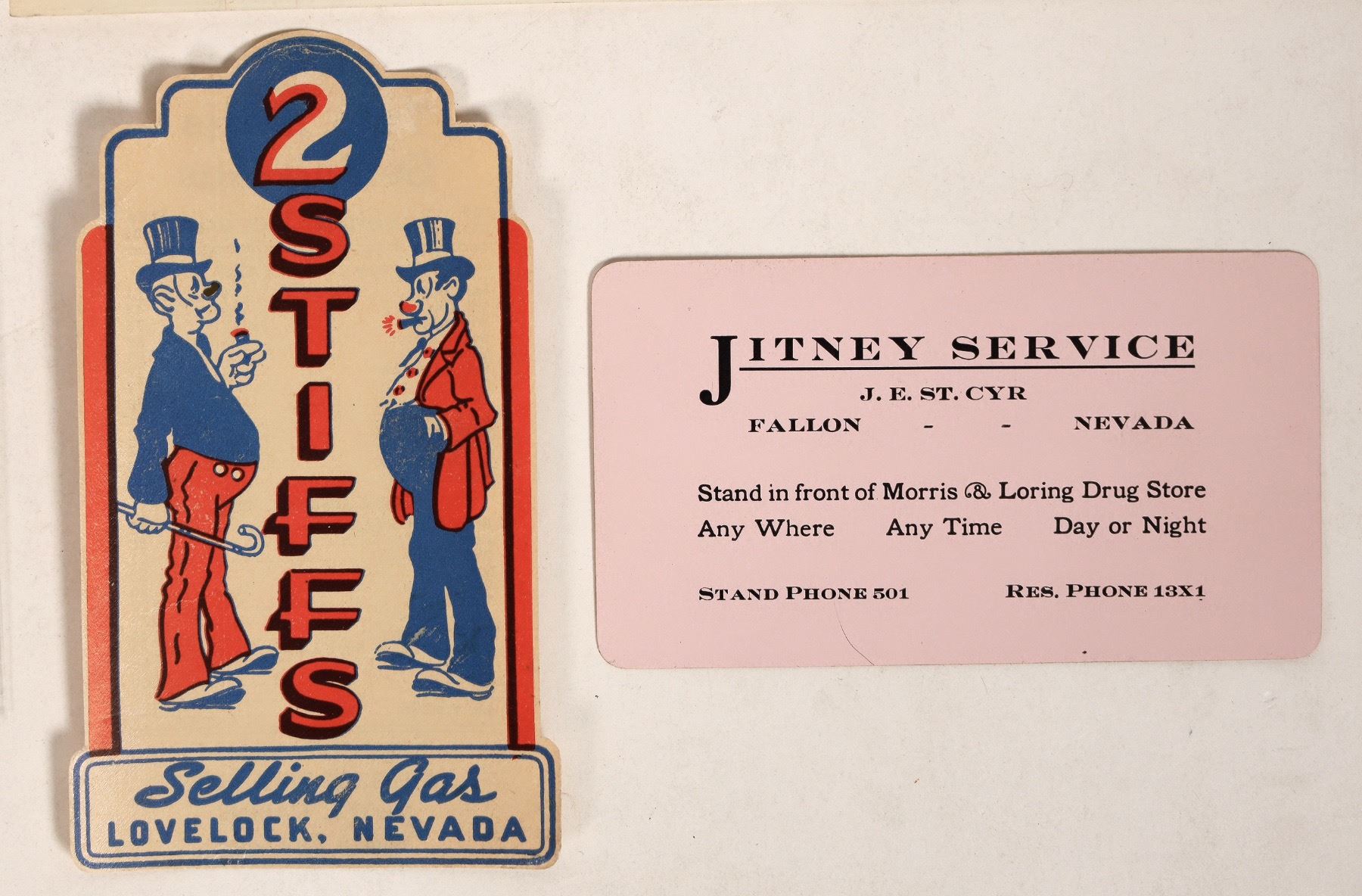 Interesting lot of (4) Nevada ephemera pieces, both old and new. The new is "2 Stiffs Selling Gas" from Lovelock, and a card for a "Jitney Service" in Fallon, any time, any where, Day or Night. The antique ephemera is from Virginia City , 1871 and Eureka, 1880, Carriage Builder and Palisade Railroad, respectively. All in excellent near-mint condition, in protective sleeves.