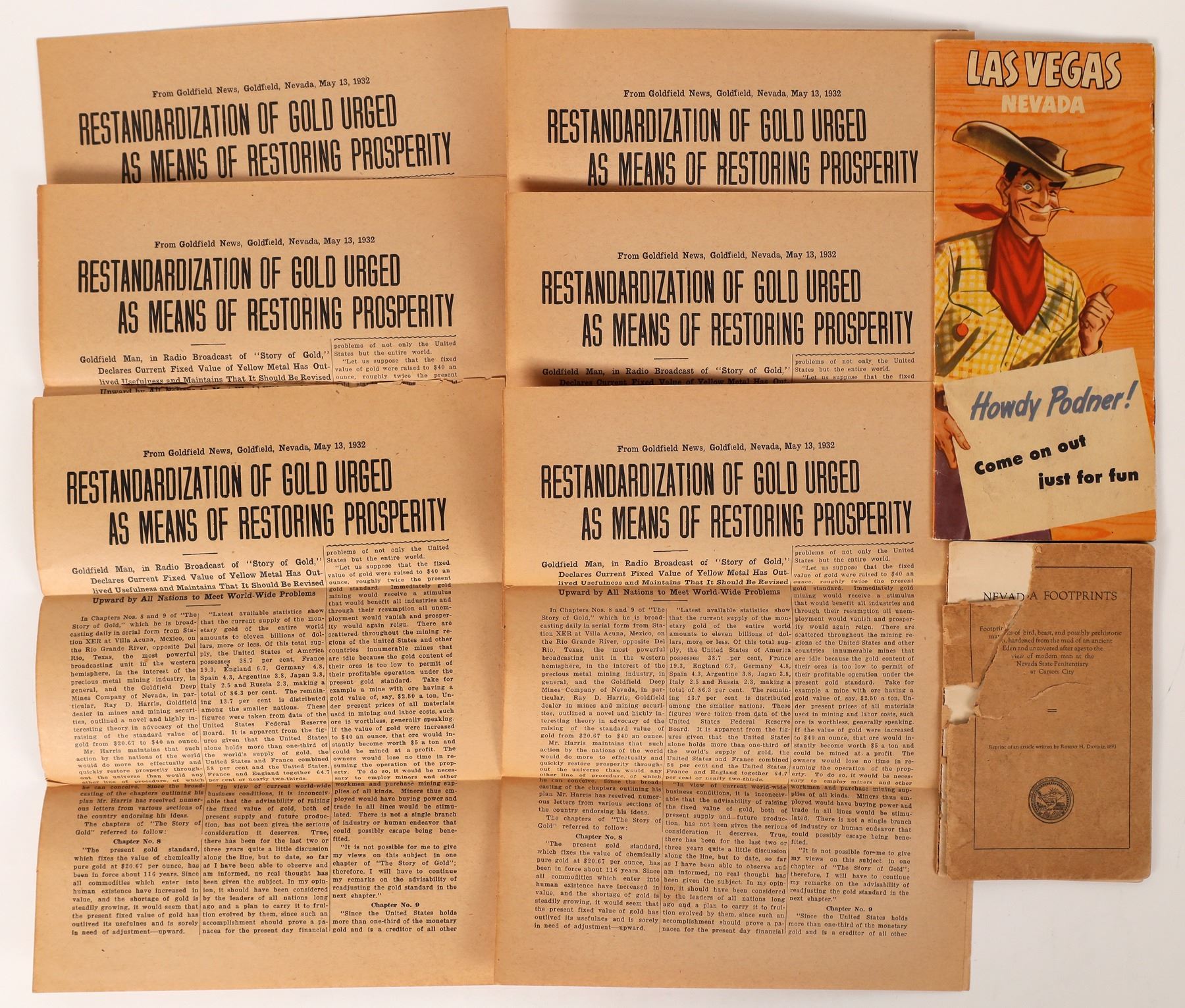 9 pieces of Nevada ephemera. Several 1932 Nevada Goldfield Mines "Story of Gold" radio broadcast notices, Nevada Footprints reprint with damaged cover, Las Vegas color promo brochure with Vega Vic on cover. Nevada